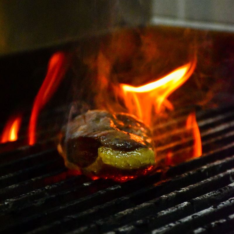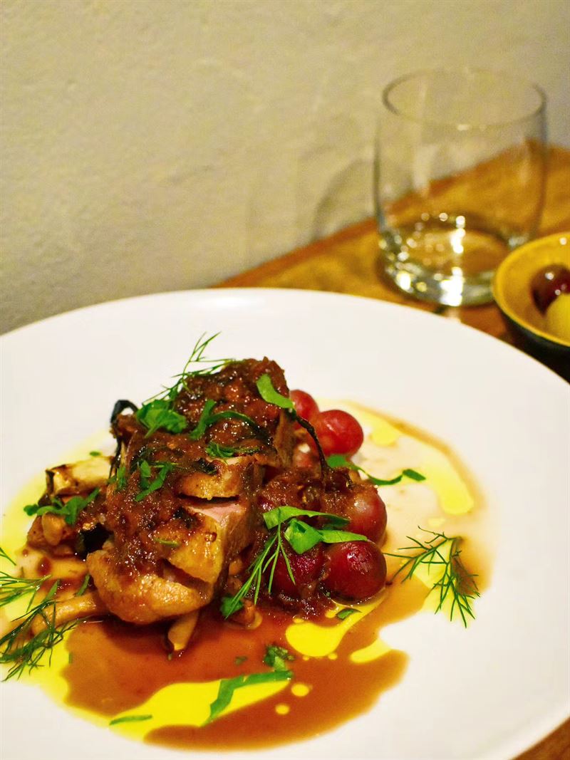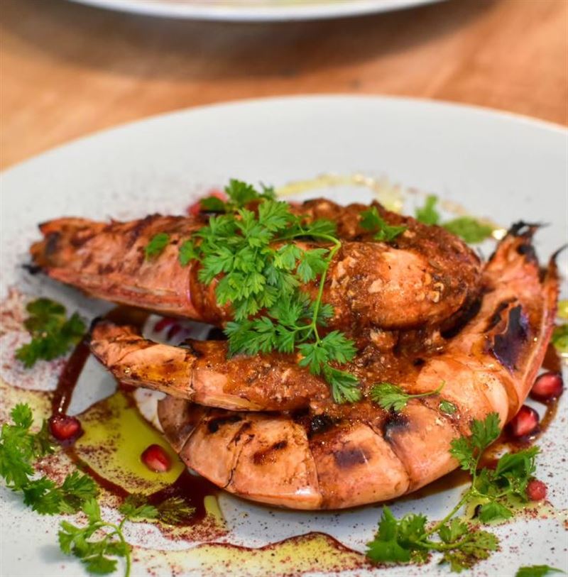 Harissa king prawns Charred duck breast with mushroom and cherry jus Chargrilled marinated chicken thigh, rocket, feta and tomatoes Toffee panna cotta and lavender
