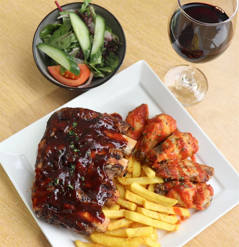Pier Parma: chicken schnitzel topped with Napoli sauce, ham, and cheese, served with chips and salad.