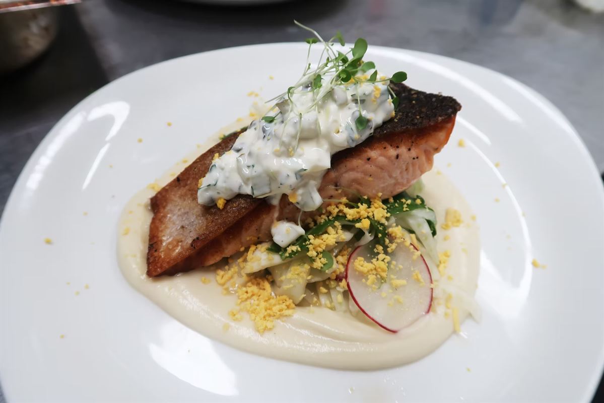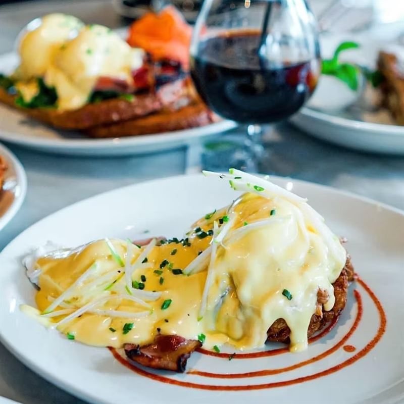 Atlantic salmon, potato rosti, avocado smash, roasted red peppers and herb citrus crème fraiche.
