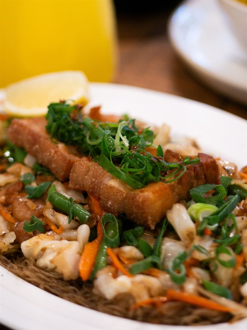 Classic Pork Sisig: roast pork, chicken liver, onion, green banana pepper, chilli, pepper, vinegar, citrus, soy sauce, topped with egg and mayonaise.