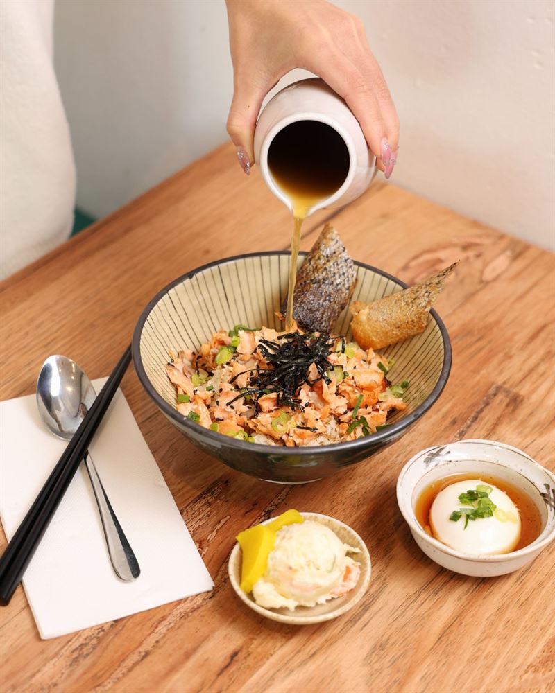 Salmon Ochazuke: seared salmon with special dashi tea broth made with roasted rice tea, served with wasabi and Japanese salted plum.