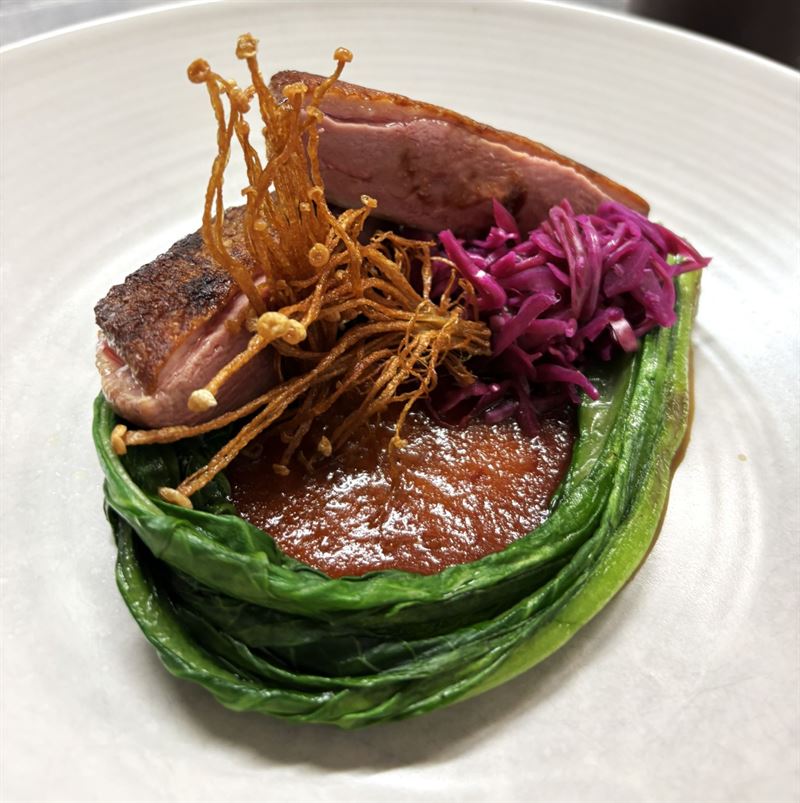Duck breast à l’orange with sous vide duck, celeriac purée, roasted Dutch carrots, Autumn greens and orange sauce.