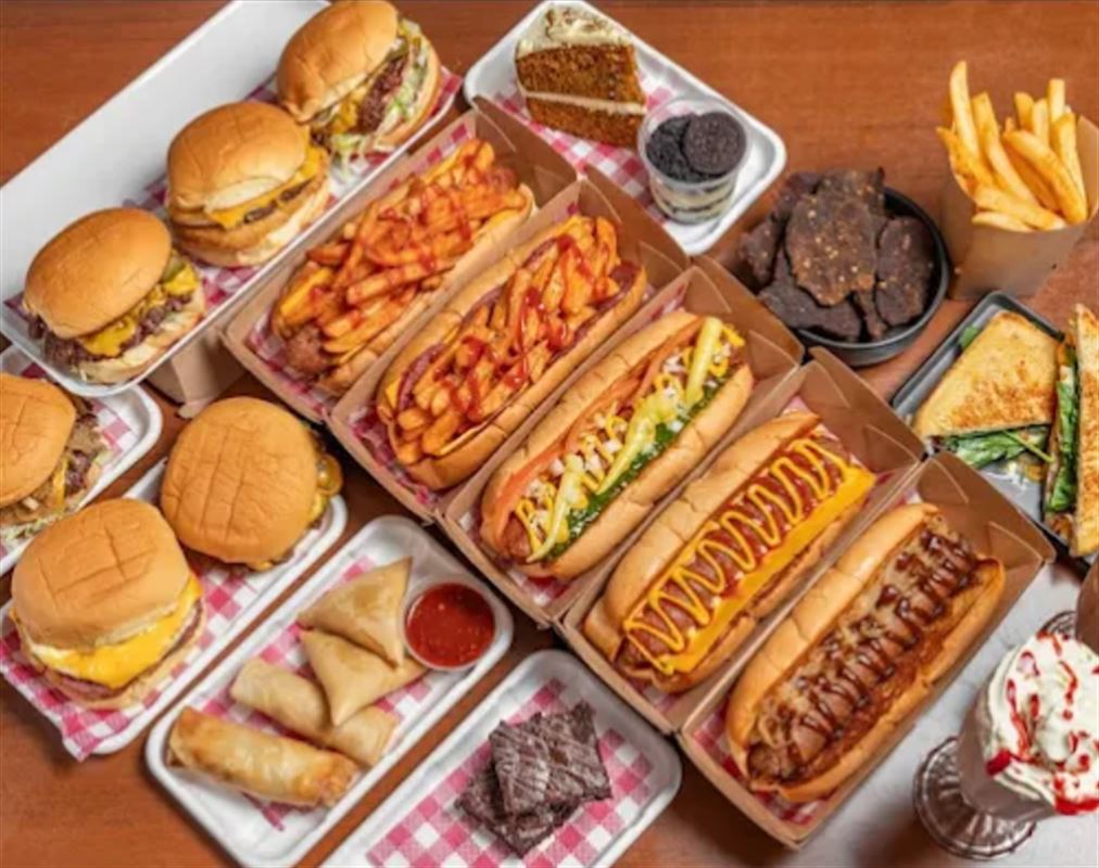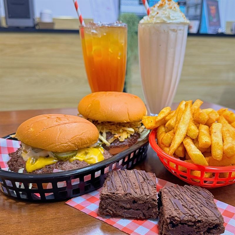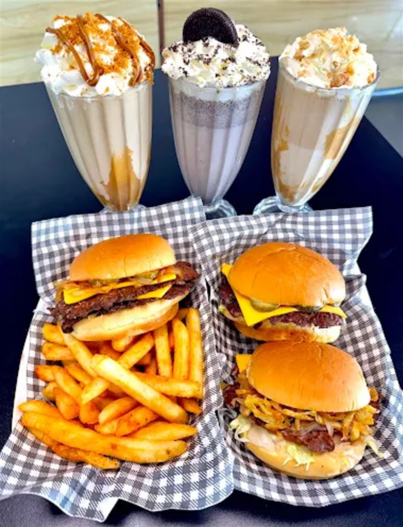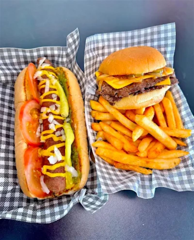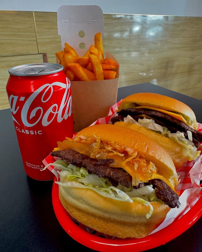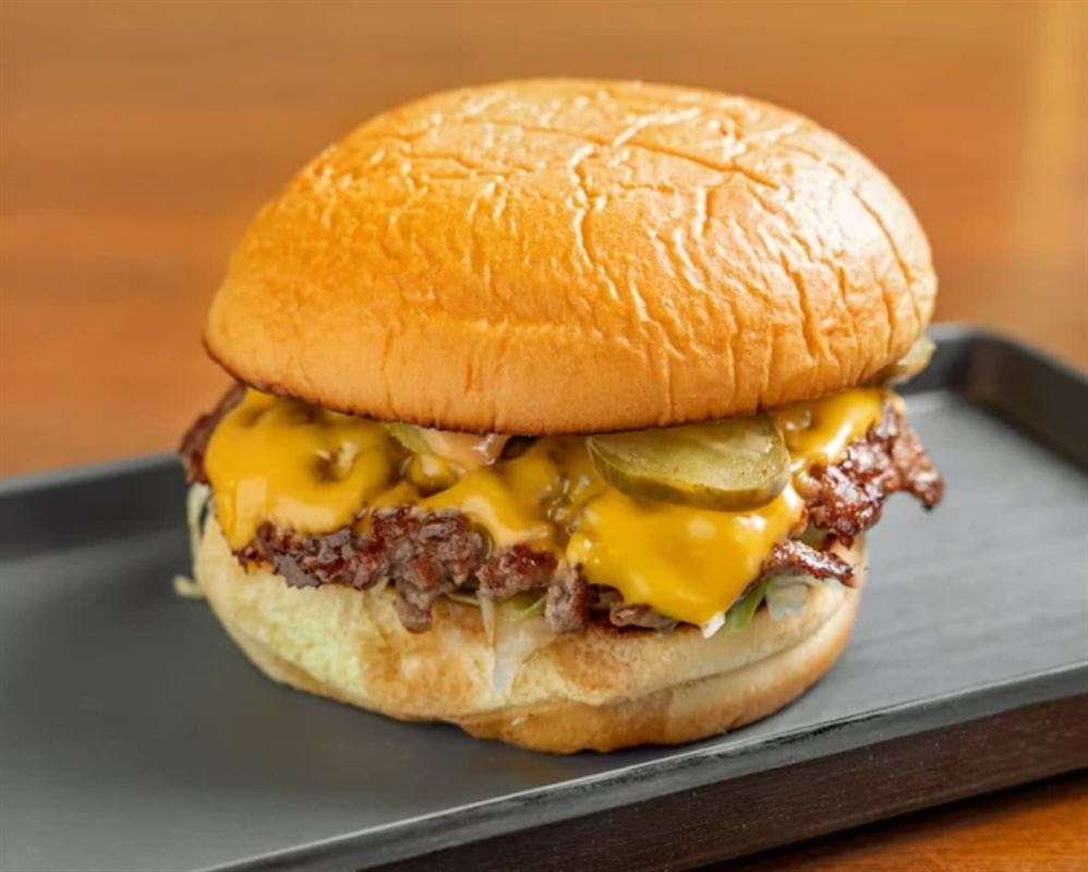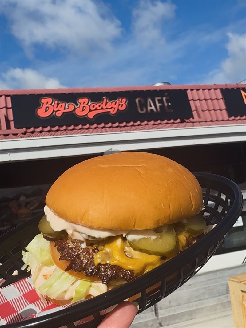 Booley beef burger, cheese, pickles, lettuce, tomato, and Booley sauce.