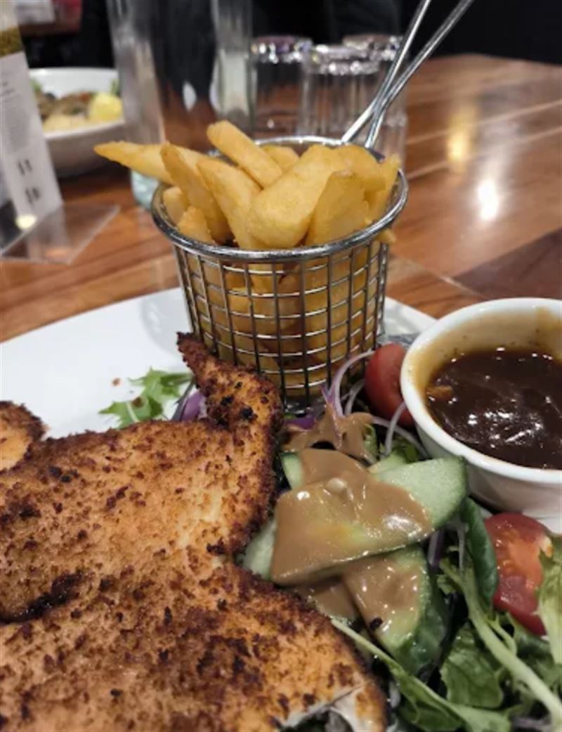 Chicken Schnitzel served with chips, salad and your choice of sauce.
