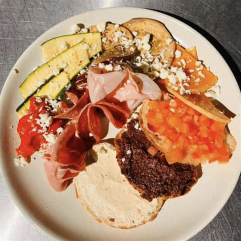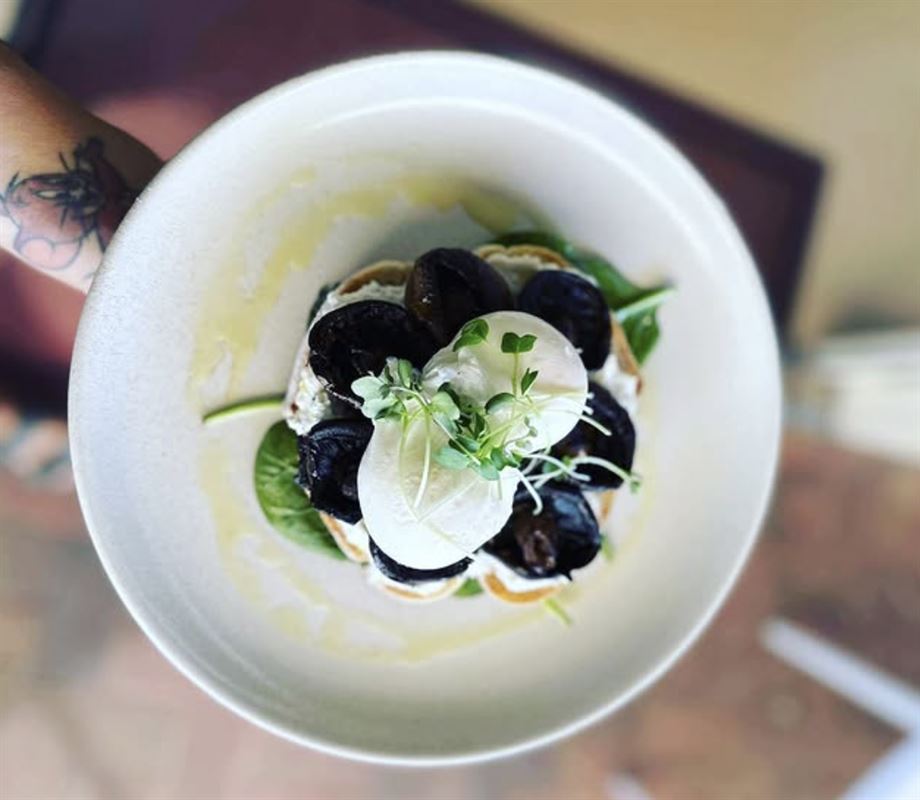 Atlantic Breaky: smoked salmon, rocket, cream cheese, eggs and chives, on sourdough.