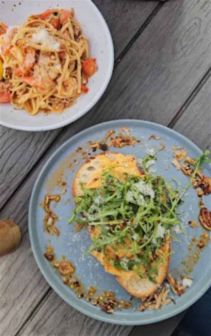 Linguine with prawns, garlic, chilli paste, lemon wedge, white wine, rocket and onion crisps.
