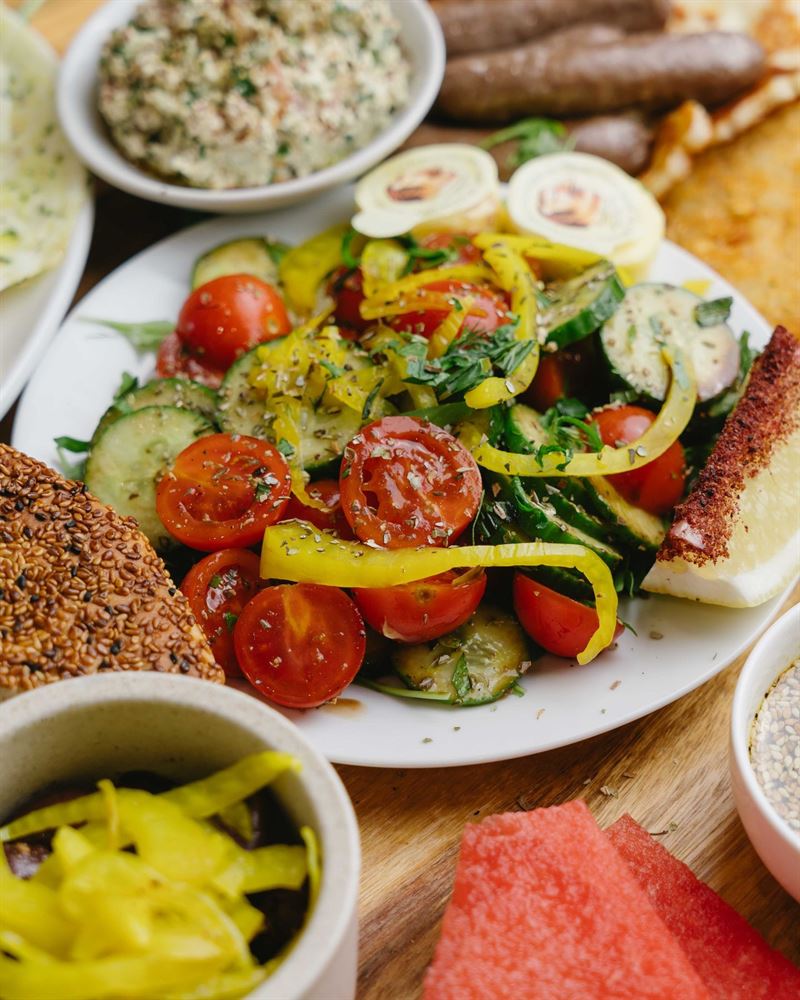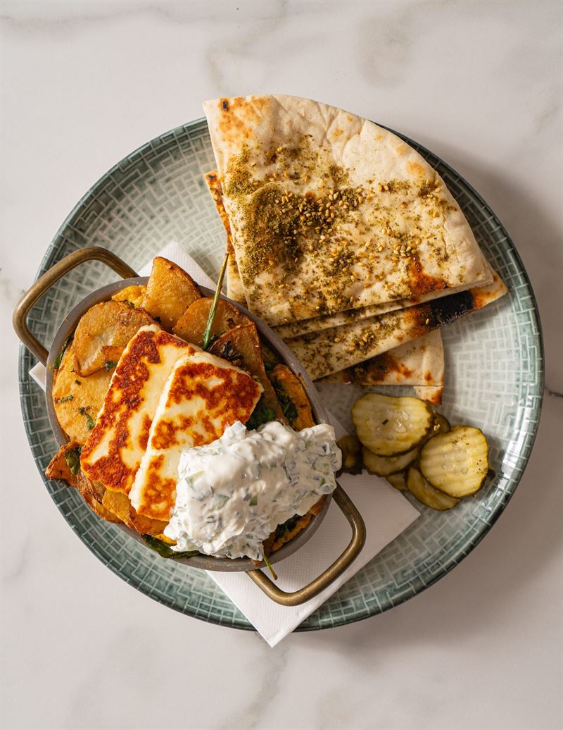 The Sultan's Breakfast: sujuk, scrambled eggs, labneh, housemade beans, grilled halloumi, tomato, cucumber, za'atar, pickles, olives, sourdough, warm kaak and a pot of tea.
