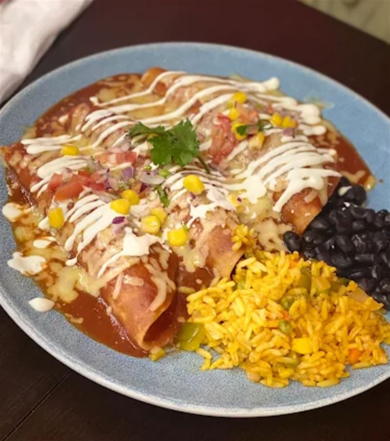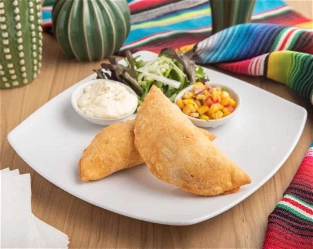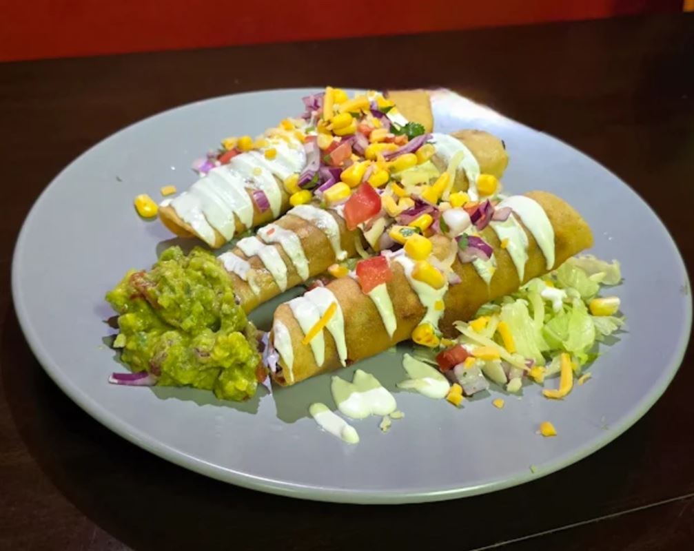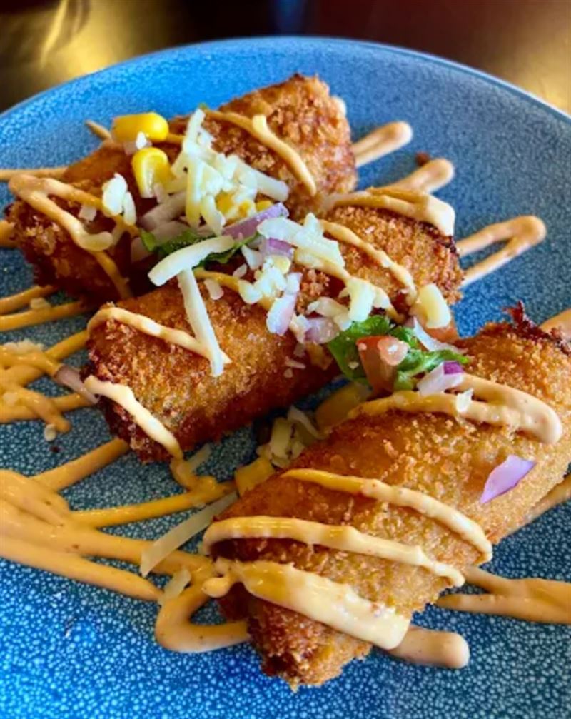 Fried burrito served with a side of Mexican rice and pico de gallo, topped with chipotle aioli.