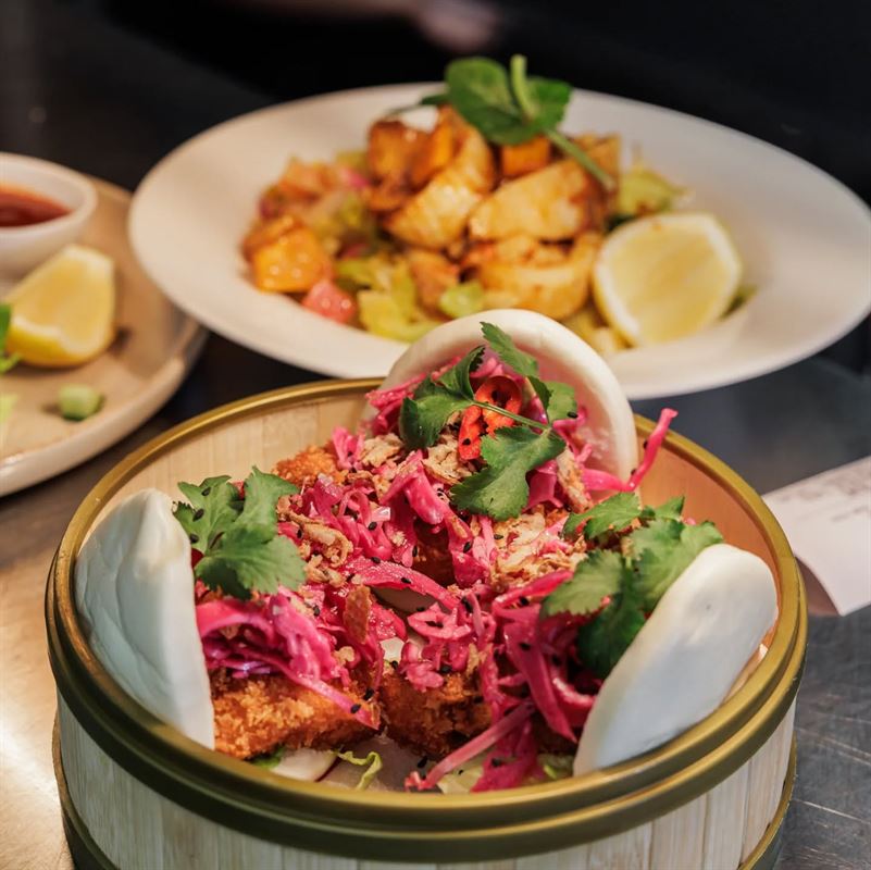 Southern Fried Chicken Burgers is made with buttermilk and spices marinated chicken, lettuce, tomato, pickled cabbage, cheddar and special sauce on a milk bun.