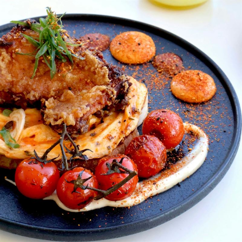 Crispy fried chicken, bacon, poached egg, mayonnaise, maple syrup, butter croissant, fried shallot, and shichimi pepper chilli.