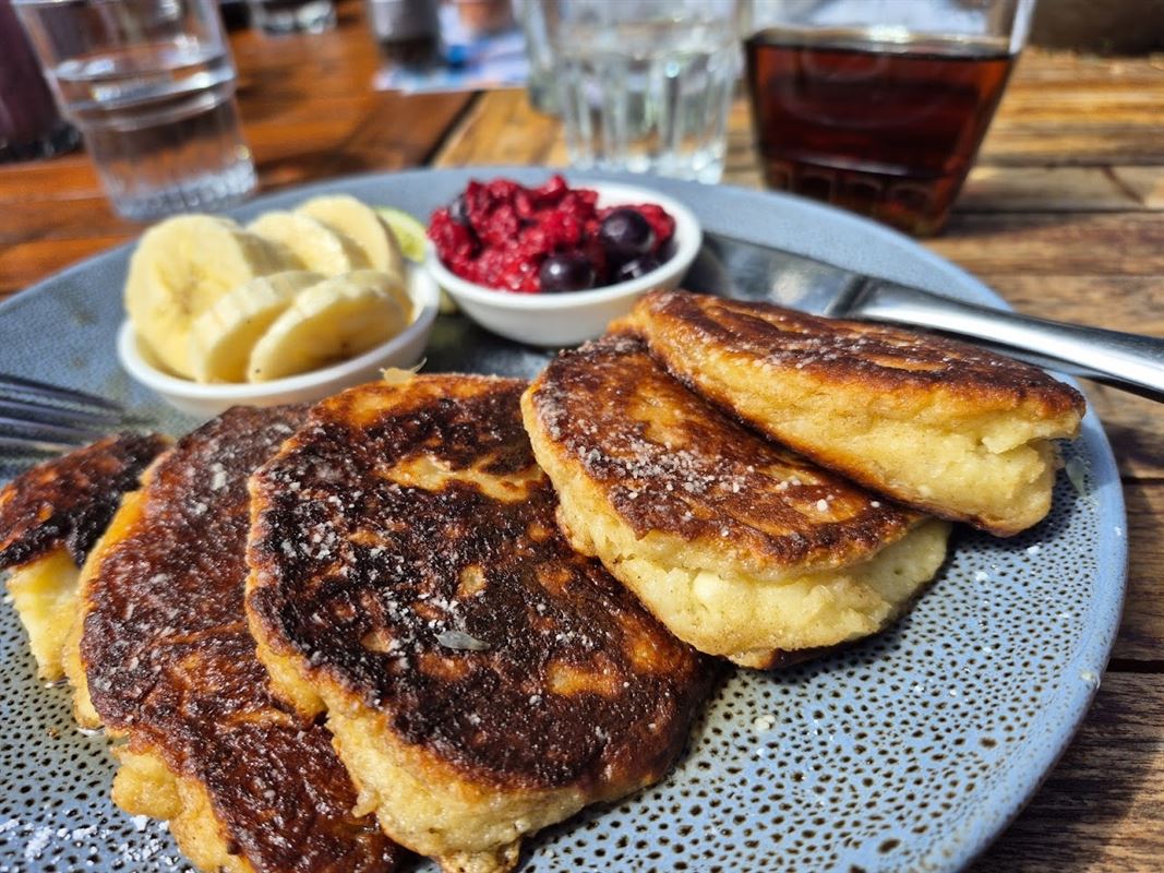 Ricotta Hotcakes with real maple syrup, berries, and banana.
