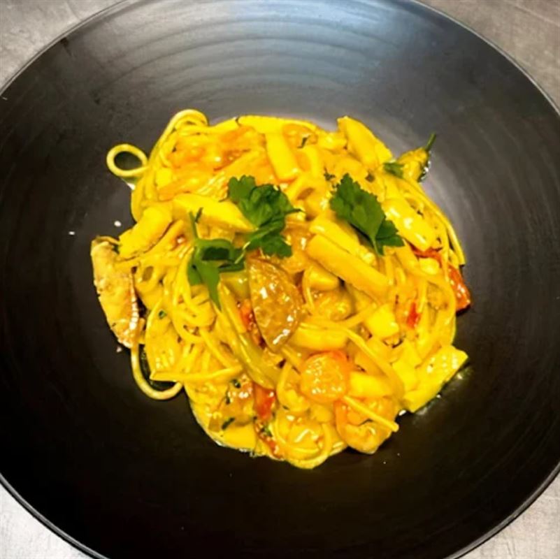 Hand made spaghetti with Frazer Island crab, prawns served with butter white wine reduction, lobster bisque.