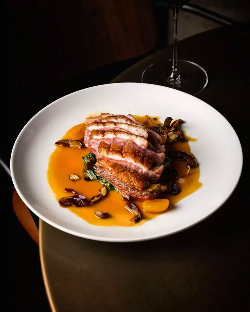 Grimaud duck breast with sautéed English spinach, shiitake, pistachio.