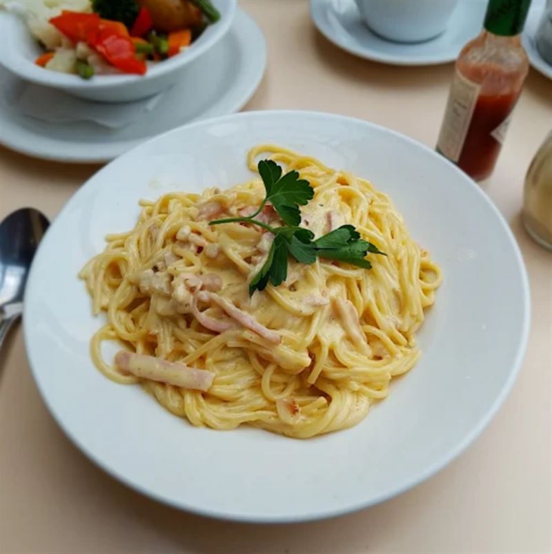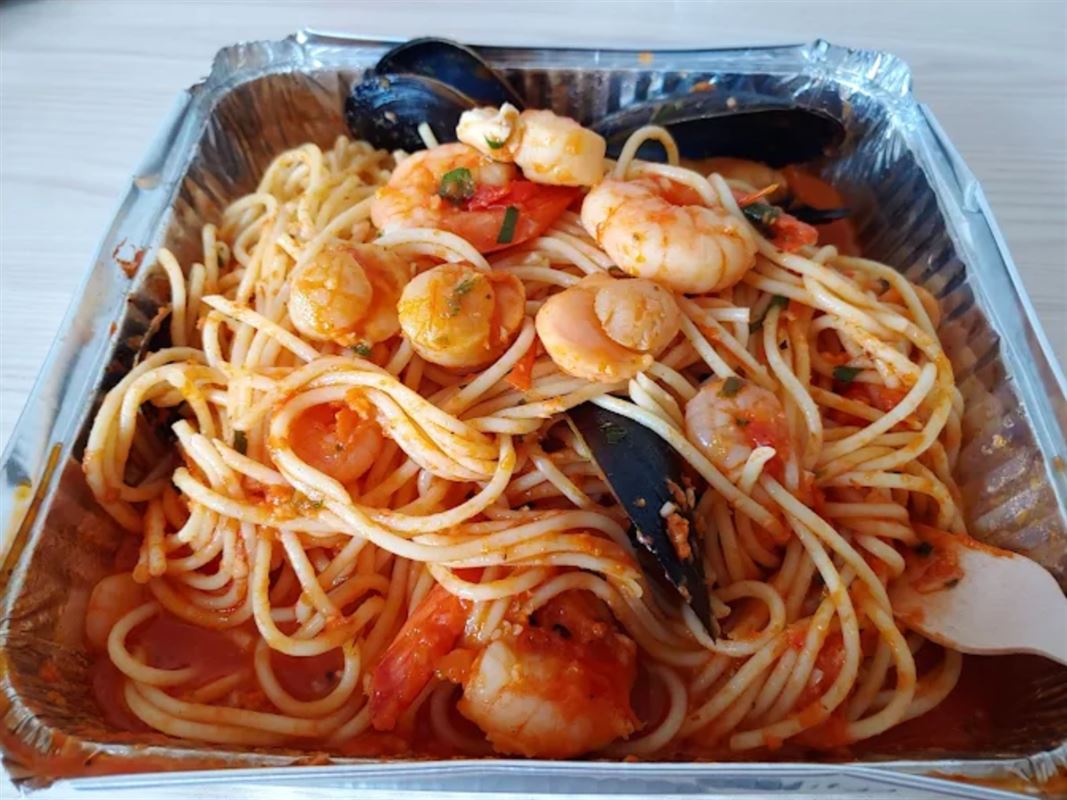 Gourmet pasta plates such as spaghetti marinara with black mussels, scallops, prawns and shrimps in garlic Napoli sauce.
