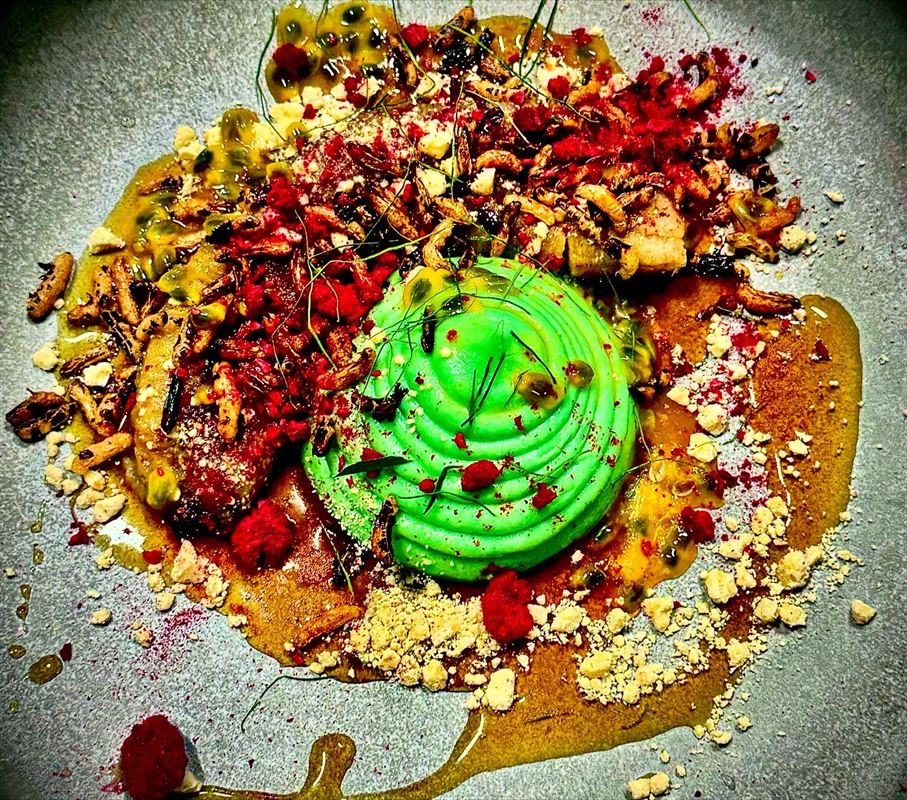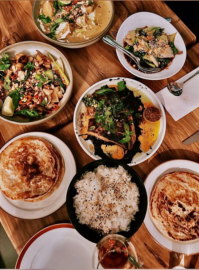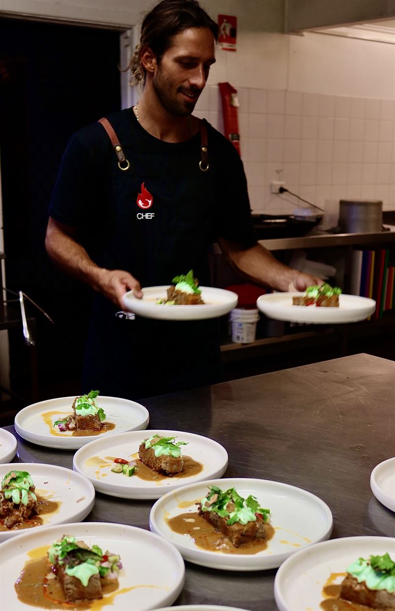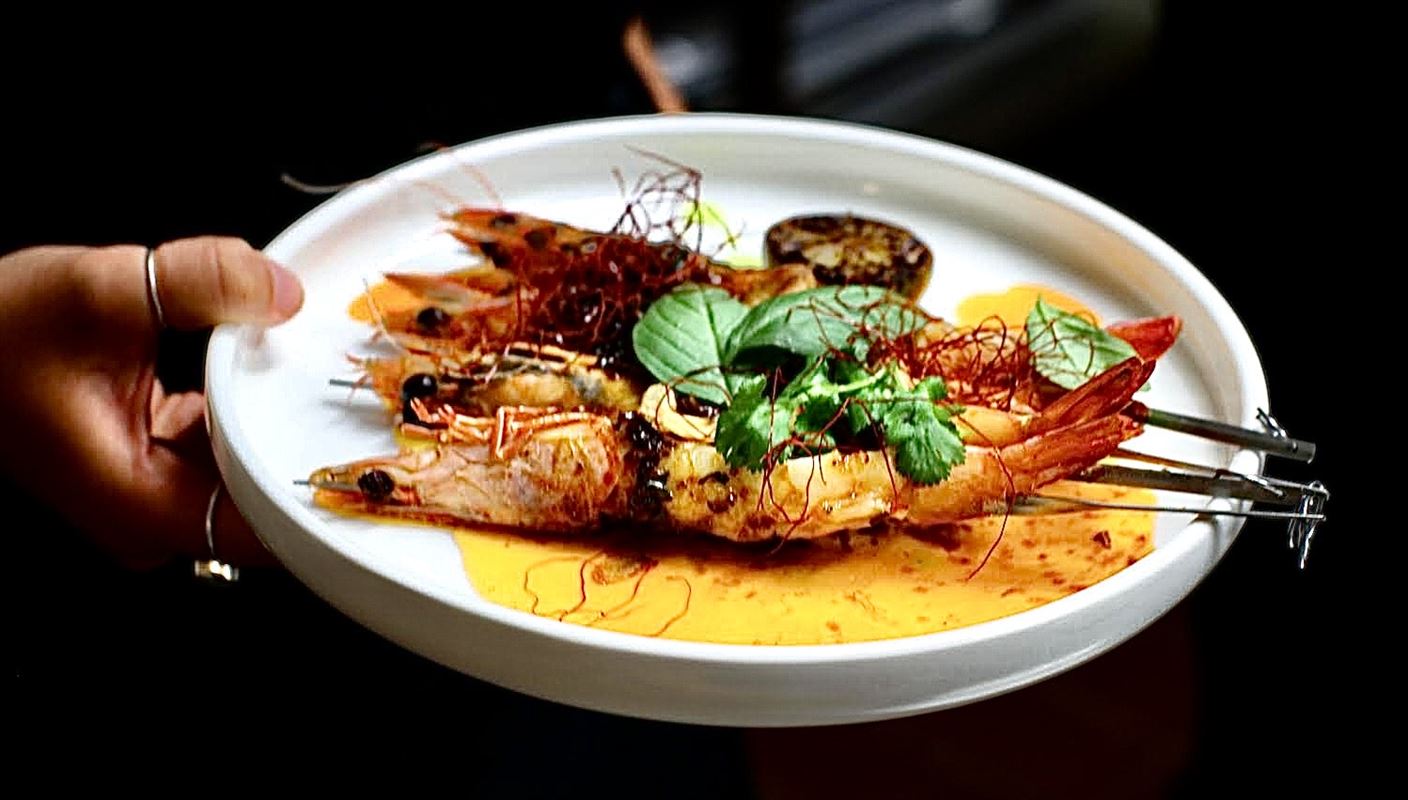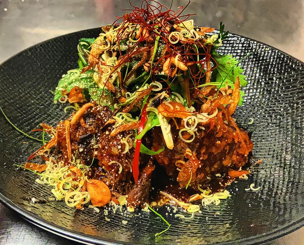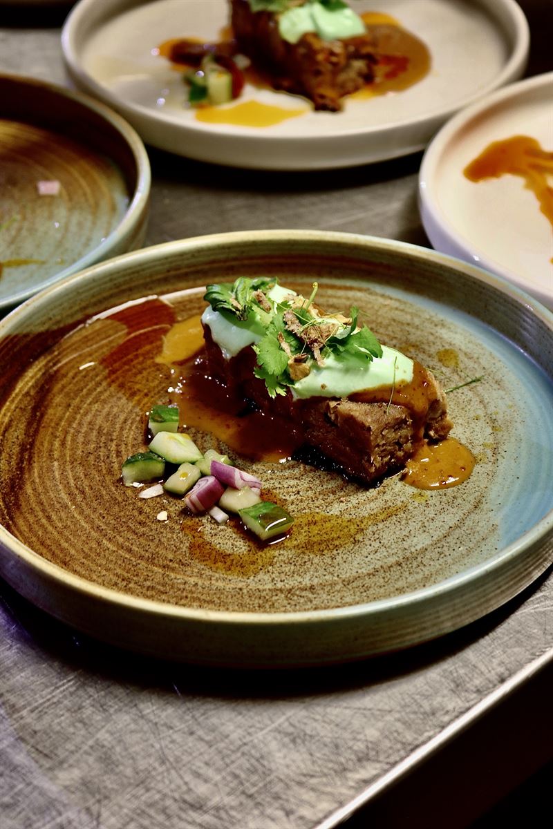 Slow-cooked Wagyu beef cheek, green papaya salad, mango chilli caramel, red chilli nahm jim, kaffir lime and lemongrass.