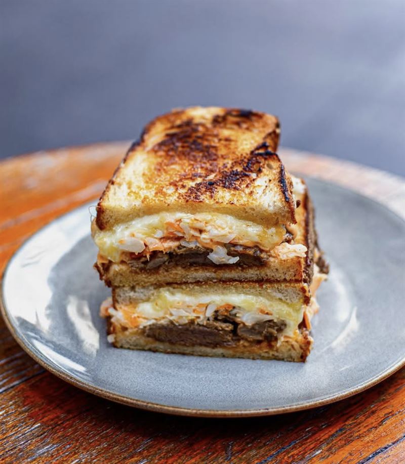 Beef Rendang toastie served with coleslaw and cheese, offering a delicious and satisfying meal for those craving a taste of Indonesia.