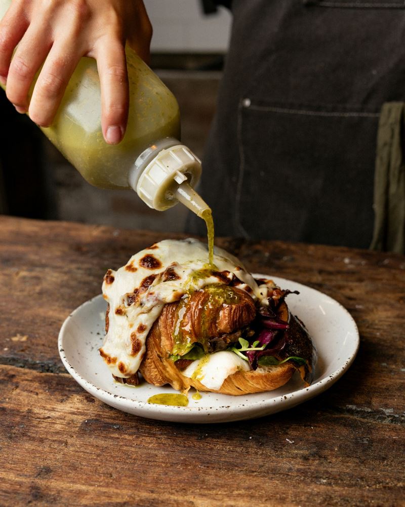 Farm Roll made with milk bun, free-range fried egg, smoky bacon, house aioli, and organic greens.