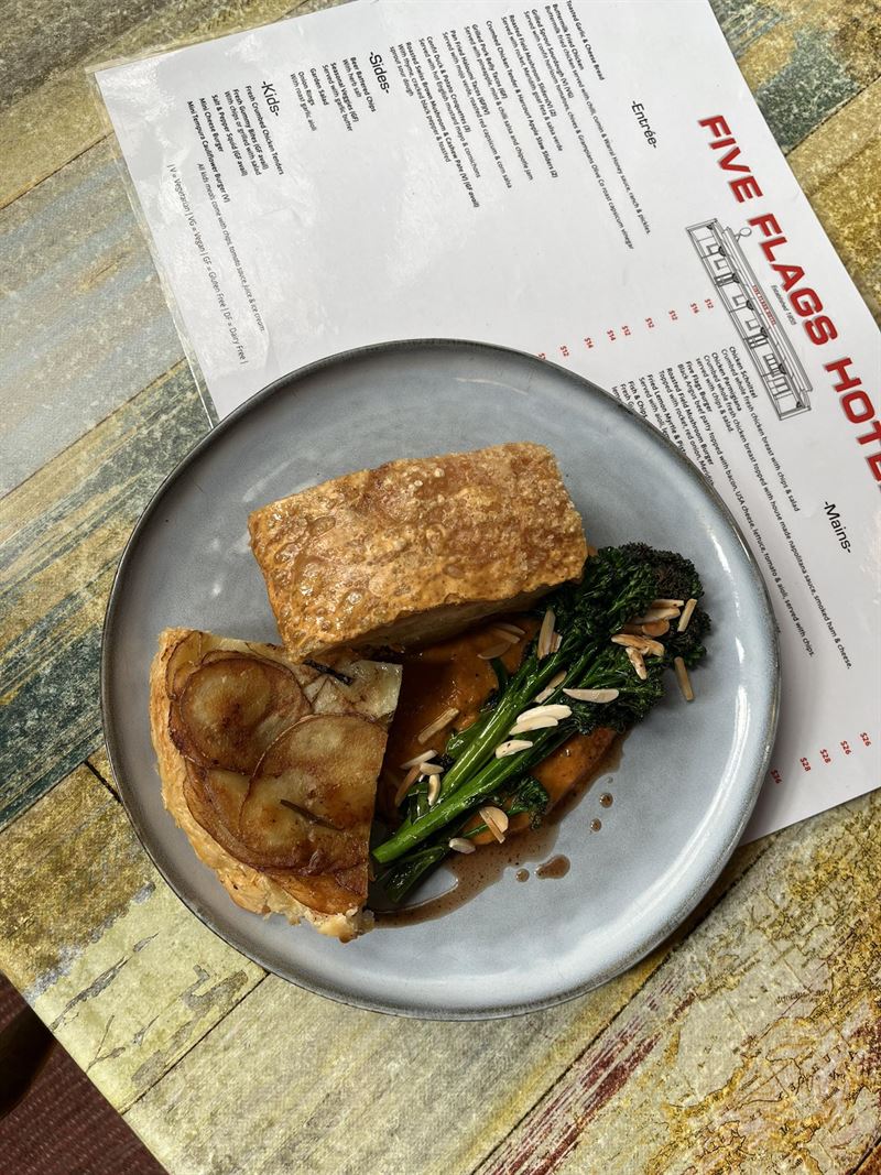 Tucked along Main Road in Campbells Creek, the historic Five Flags Hotel welcomes guests with rustic charm and warm country hospitality. This character-filled pub and restaurant feels like the beating heart of the community, where locals and visitors gather over hearty meals and lively conversation. Its inviting interiors blend old-world heritage with a relaxed, contemporary feel - timber accents, vintage memorabilia and a glow of friendly atmosphere set the tone. Outside, the spacious beer garden is perfect for lazy afternoons under the trees or evening gatherings under twinkling lights. With generous plates that celebrate classic pub favourites and modern twists, devour confit duck and potato croquettes, English mustard mayo and cornichons, or buttermilk fried chicken, ranch and pickles.