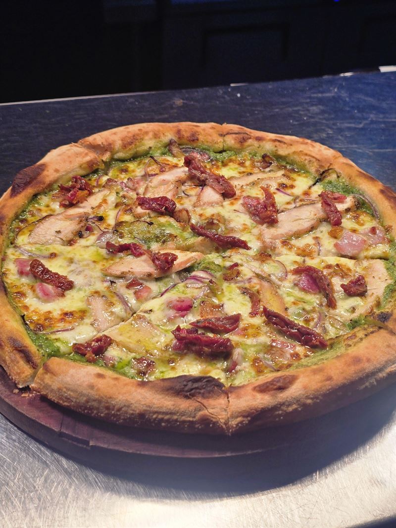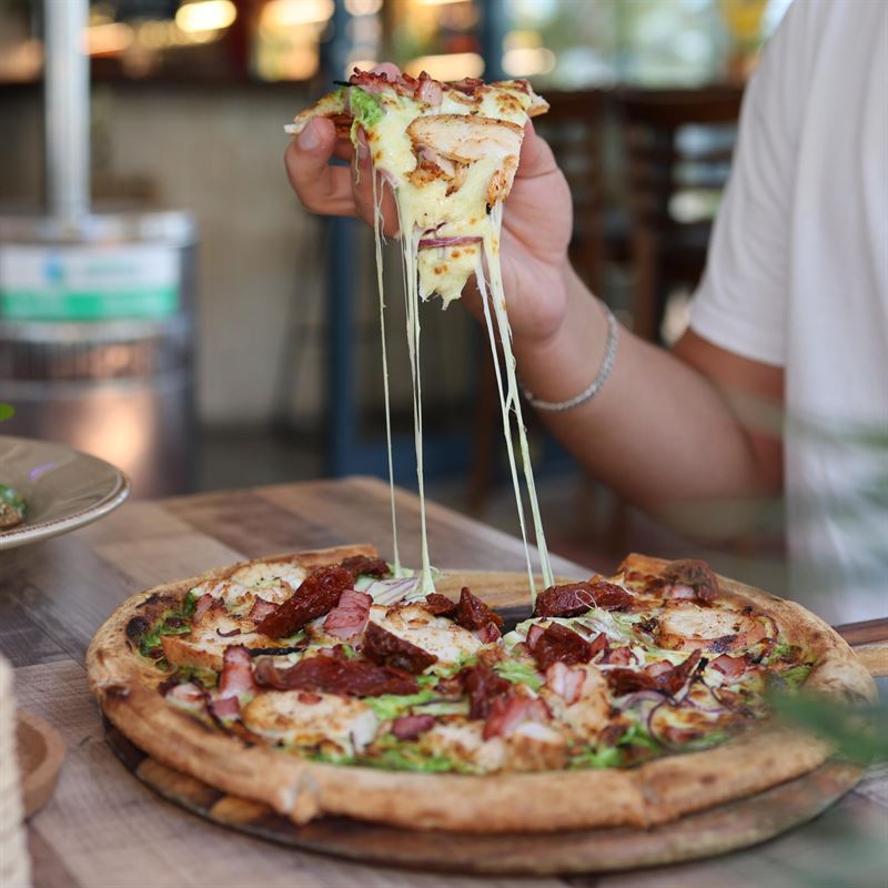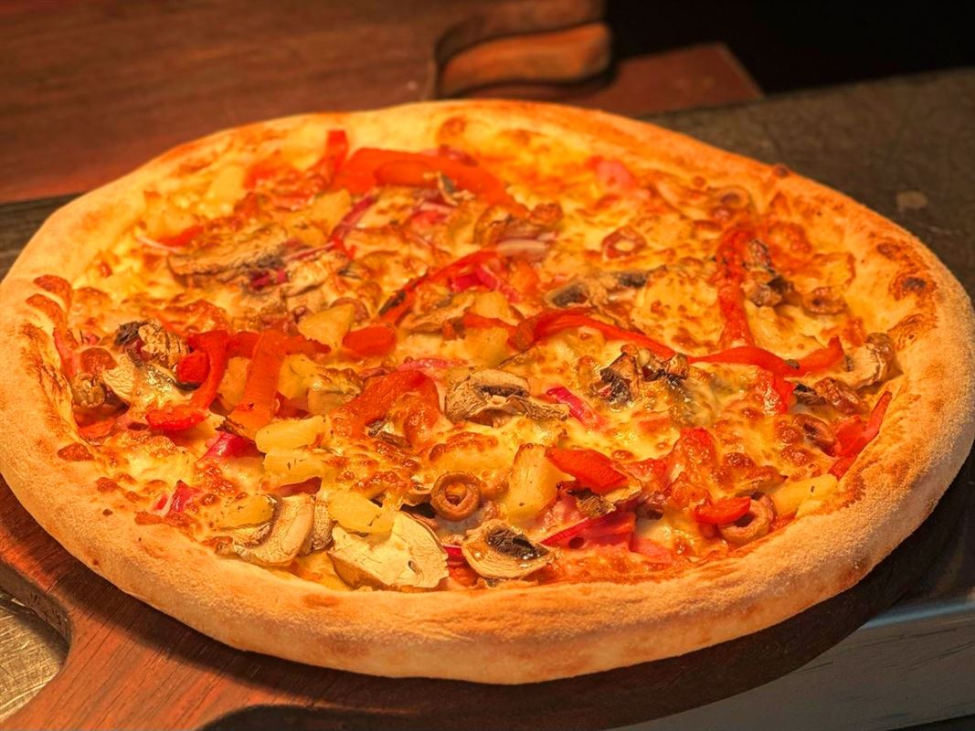 Gourmet pasta and pizza such as the Florentina with Napoli sauce, mozzarella, ham, salami, pineapple, roasted capsicum, red onion, mushroom and olives.