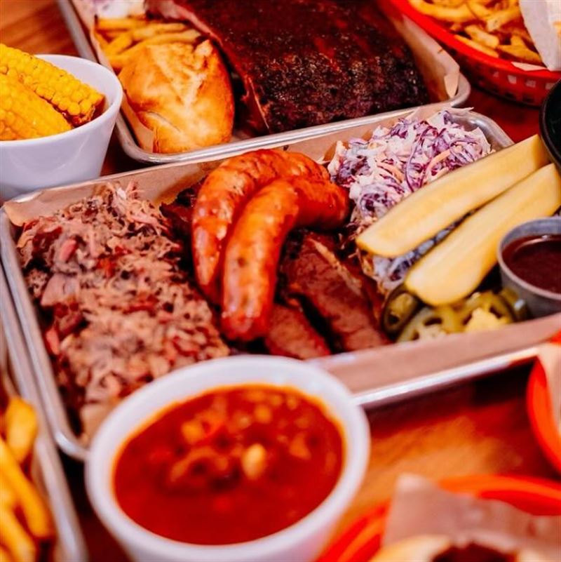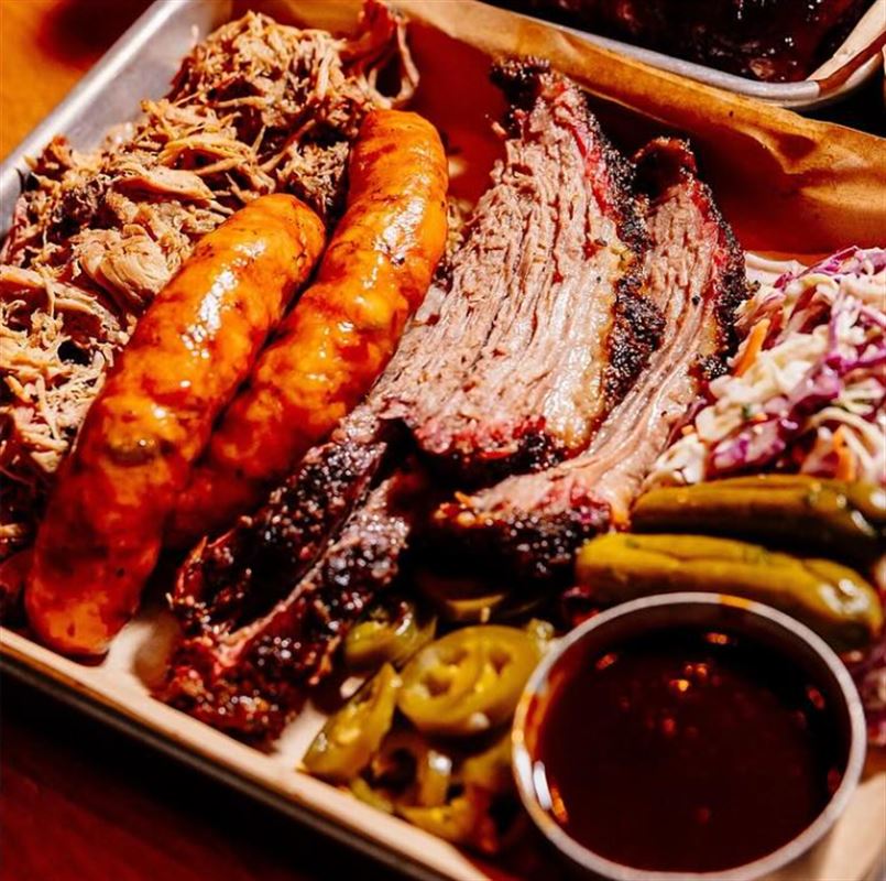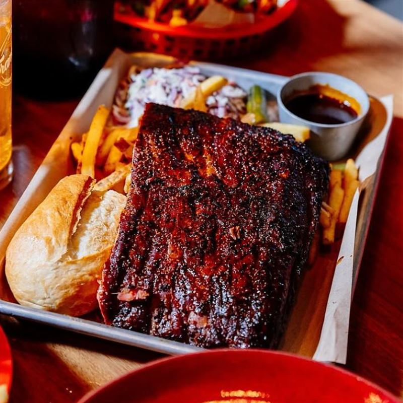 12-hour smoked beef brisket plate with coleslaw, pickles, jalapeños, BBQ sauce, fries, bread and butter.
