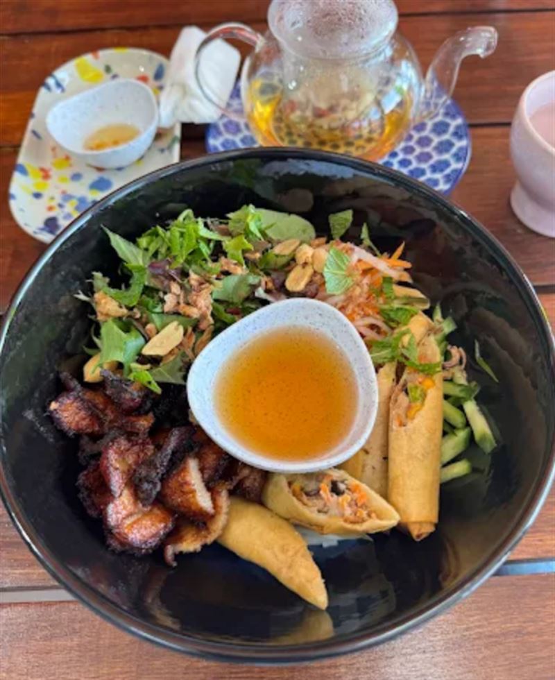 Halcyon Nest Vietnamese, tucked along Gartside Street in Wanniassa, is a serene hideaway that hums with the comforting warmth of family cooking and the soft rhythm of conversation. Its atmosphere blends modern simplicity with rustic charm — think timber accents, muted lighting and the aromatic swirl of lemongrass and star anise drifting from the kitchen. The menu celebrates the heart of Vietnamese cuisine: fresh herbs, slow-cooked broths and the delicate balance of sweet, sour, salty and spicy. Start a memorable meal with pork and prawn spring rolls with nuoc cham, or chicken pho, with rice noodles, bean sprouts, hoisin and sriracha. For the main, devour a grilled pork chop with sunny side-up eggs, rice, shallots, pickled carrot and daikon, cucumber, tomatoes, chilli and house sauce.