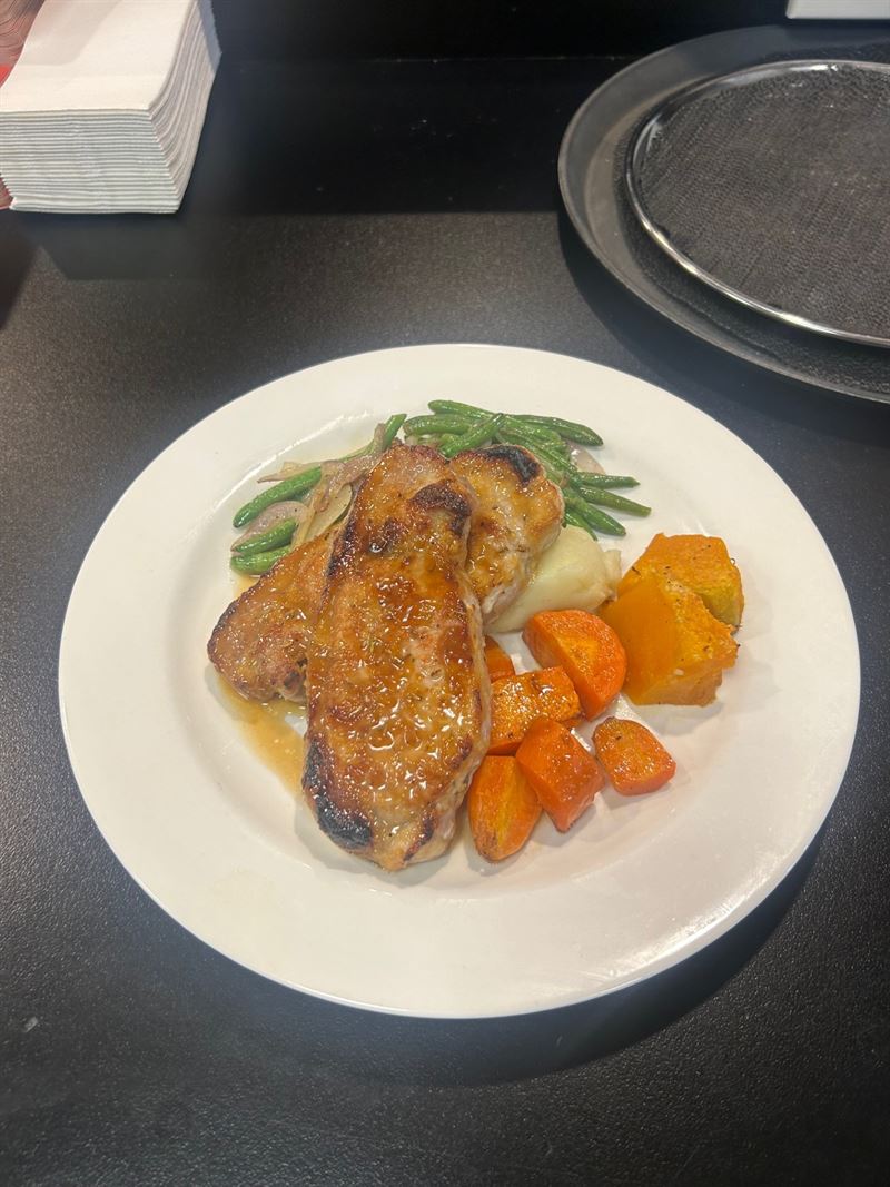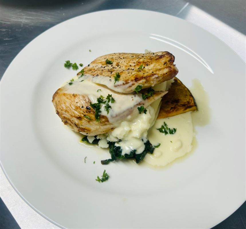Chicken Julienne: crumbed chicken strips served with pepper gravy; extra charge applies for gravy substitutions.