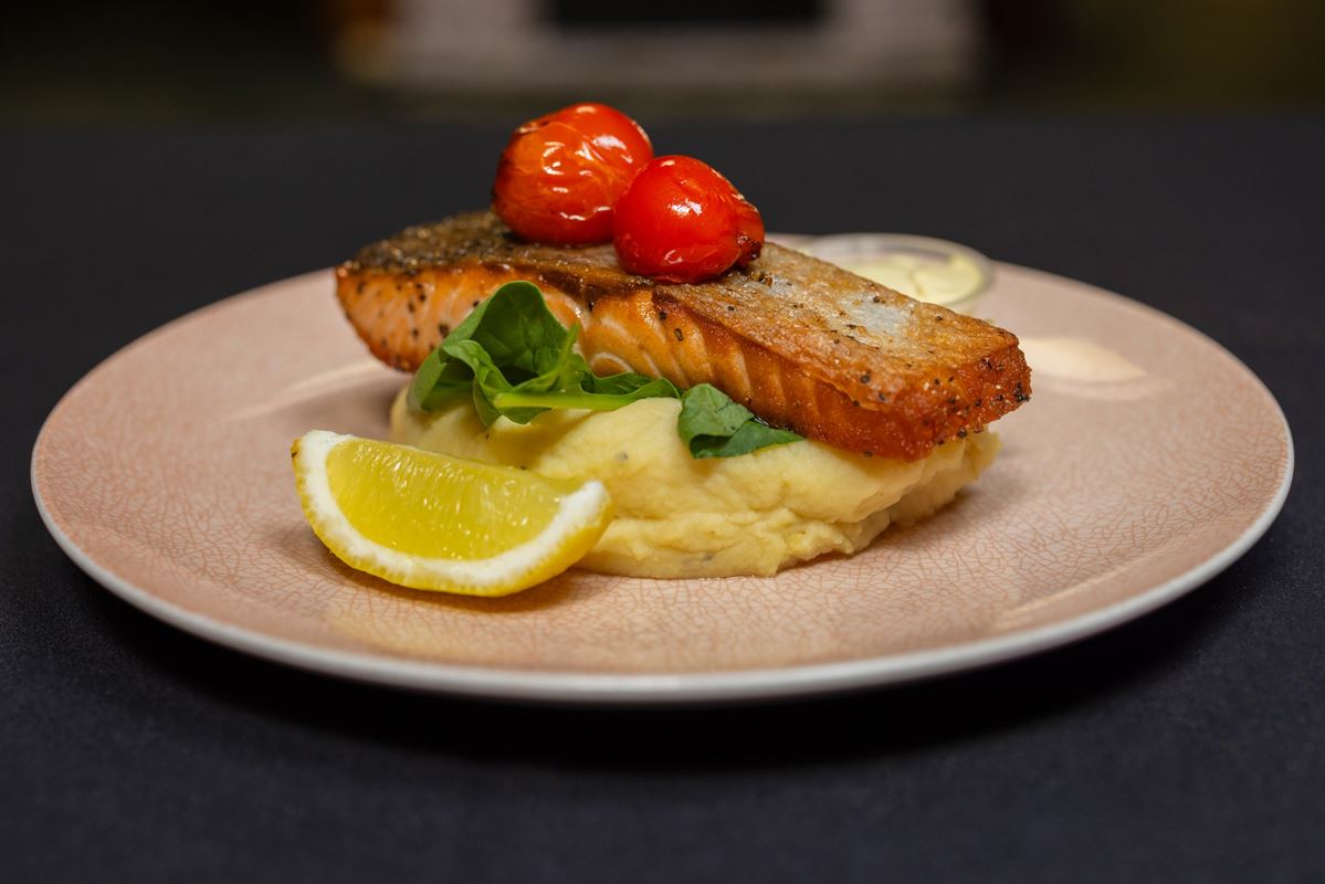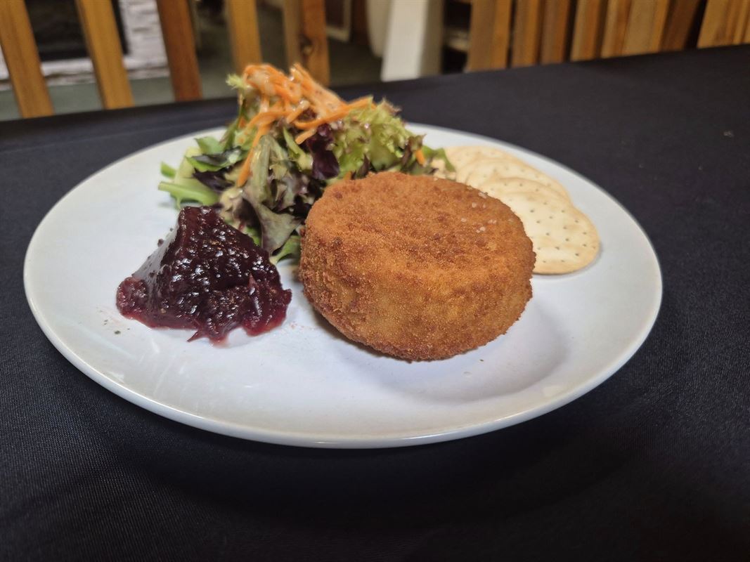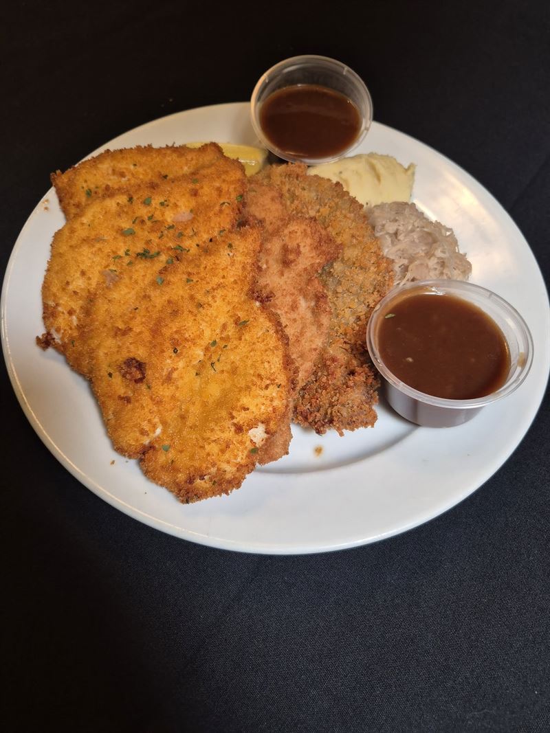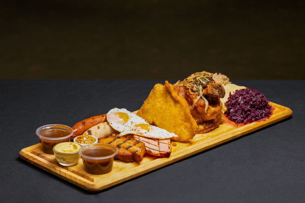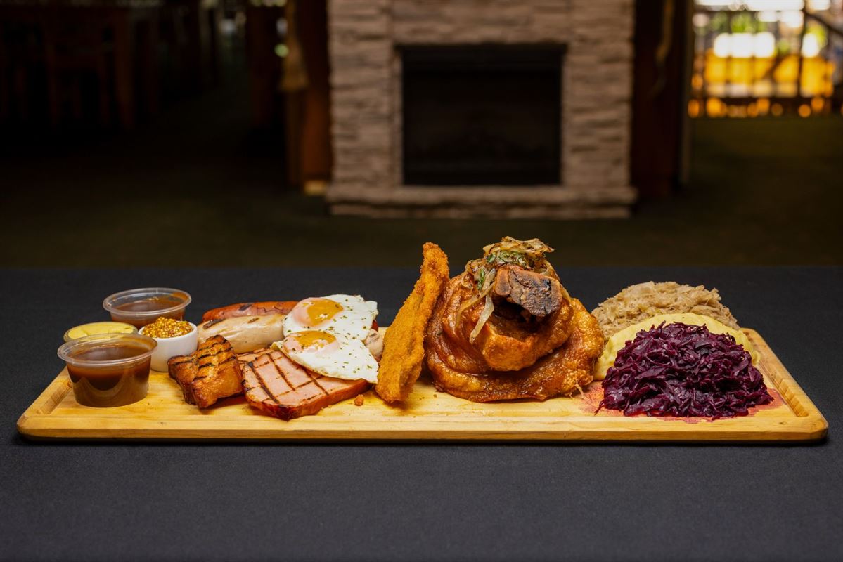 Pork knuckle served with creamy mashed potato, red cabbage and sauerkraut, finished with fried onions, haus gravy and apple sauce for a hearty, traditional favourite.