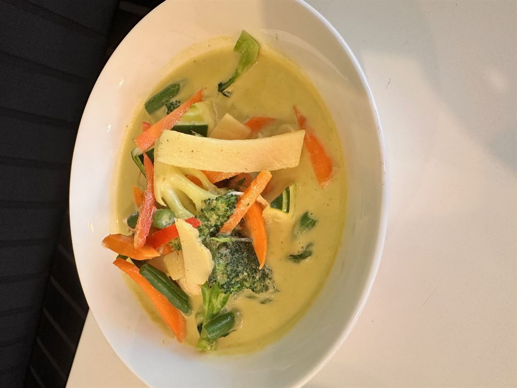 Vermicelli rice noodles in creamy Laksa curry soup with coconut milk.