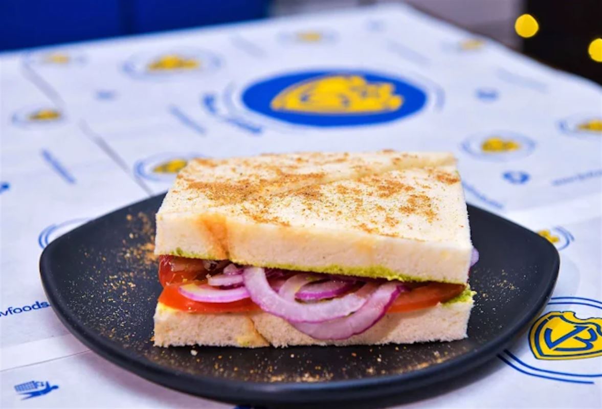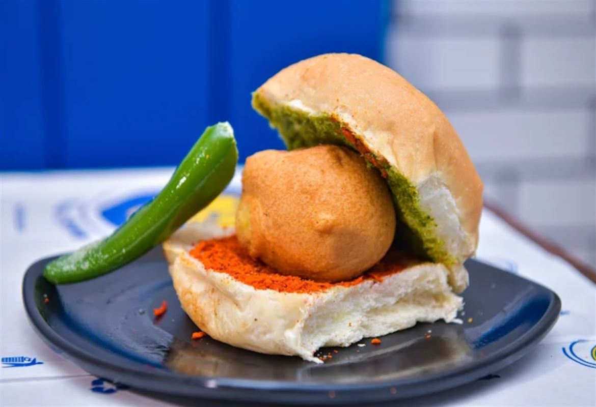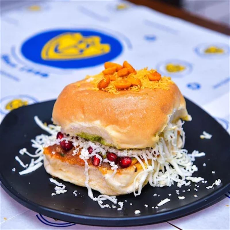 Exotic Vadapav: fried potato balls, between two buns with spicy chutney, cheese and raw vegetables.
