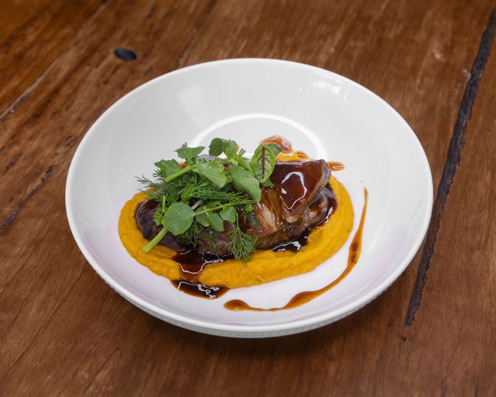 Smoked Lamb rump with honey glazed carrot puree and red wine jus.