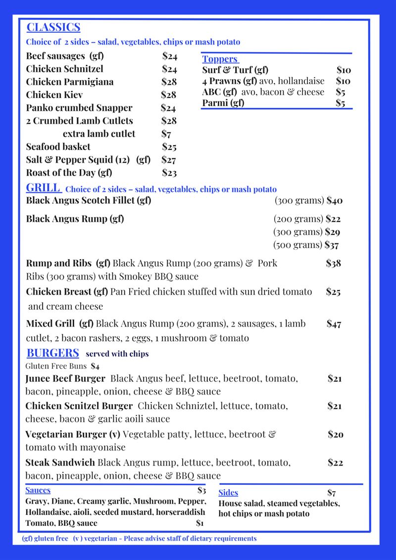 At the top of the menu sits the hero dish: the Premium Riverina Black Angus Rump Steak. Renowned for its marbling, flavour and tenderness, this steak is sourced directly from the fertile Riverina region, an area recognised across Australia for its world-class beef. Cooked with precision and served with classic sides and house-made sauces, it's a true showcase of Junee's regional dining experience.