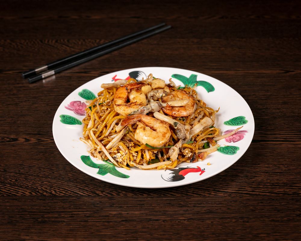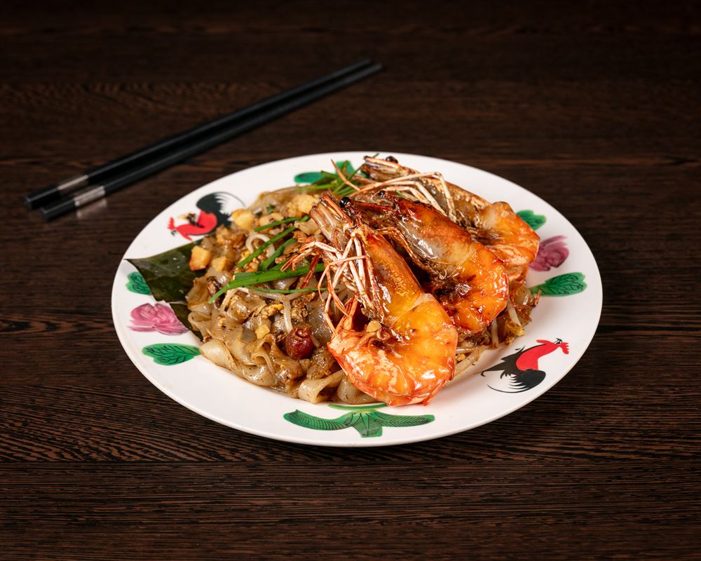 Penang Famous Char Koay Teow – stir-fried flat noodles with prawns, Chinese sausage, egg, bean sprouts, pork lard, chives and chilli.