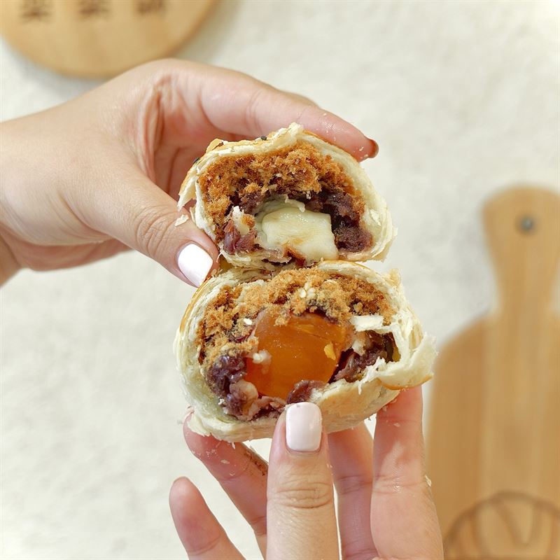 Pastry King made with pork floss, red bean, mochi and salted egg yolk for a burst of flavour on the inside.