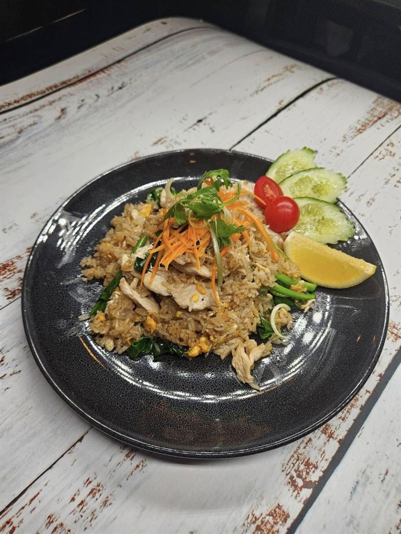 Cashew Nut fried rice with egg, cashew nuts, sweet chilli jam, mix vegetable, and shallots for a delightful crunch.