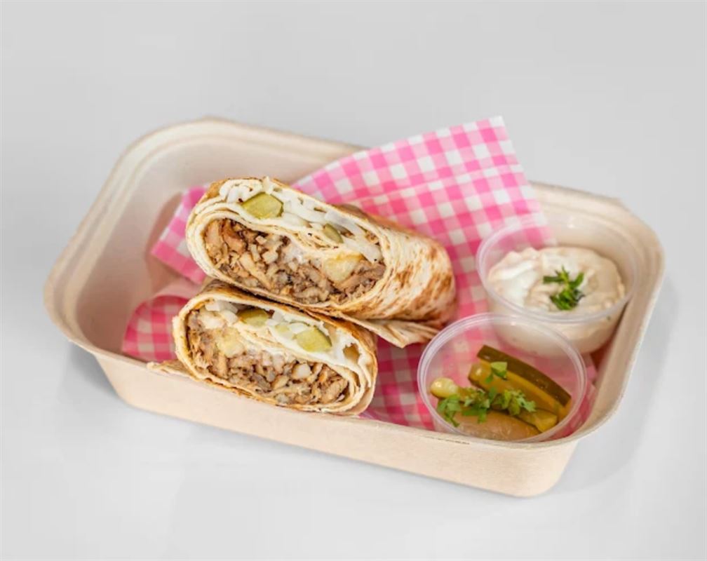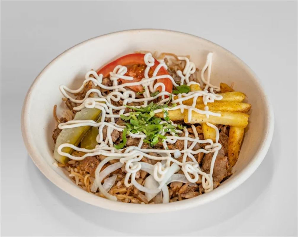Canteen Rice Pack served with hummus, onions, tomatoes, pickled cucumber, garlic.