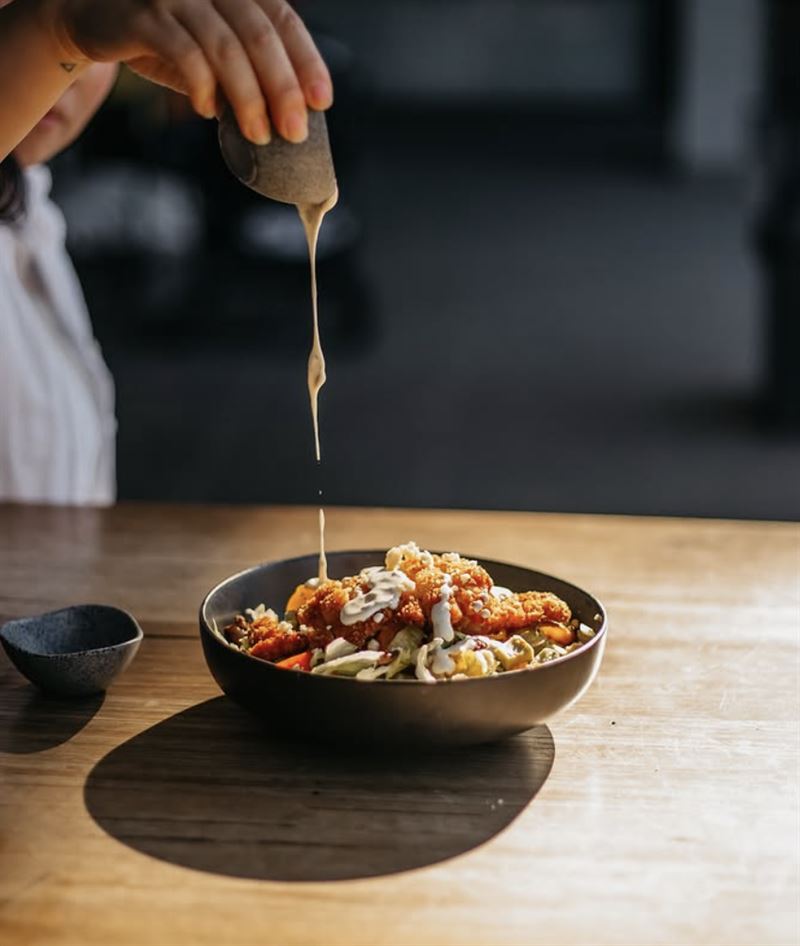 Crunchy Cobb Salad: crispy chicken schnitzel, bacon, avocado, cherry tomato, lettuce, cheddar and ranch dressing.