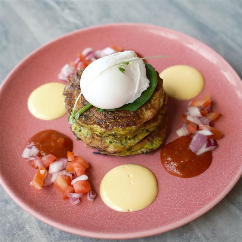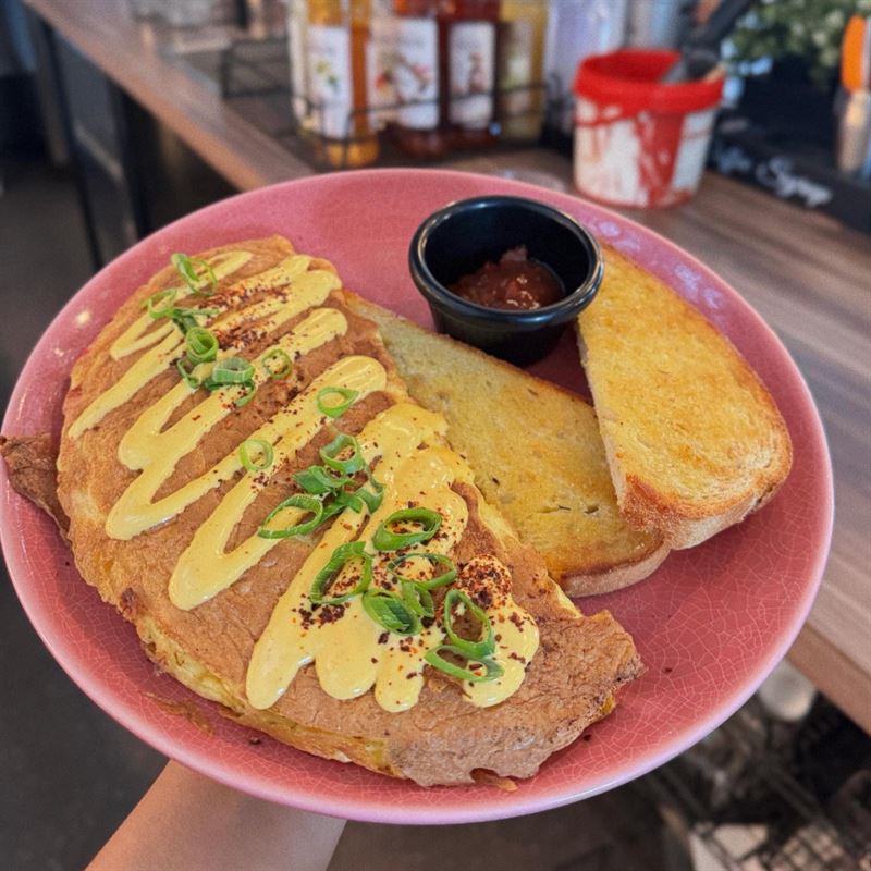 Avocado Bruschetta is made with Smashed avo loaded with tomato salsa, Dukkah, balsamic glaze and lemon wedge.