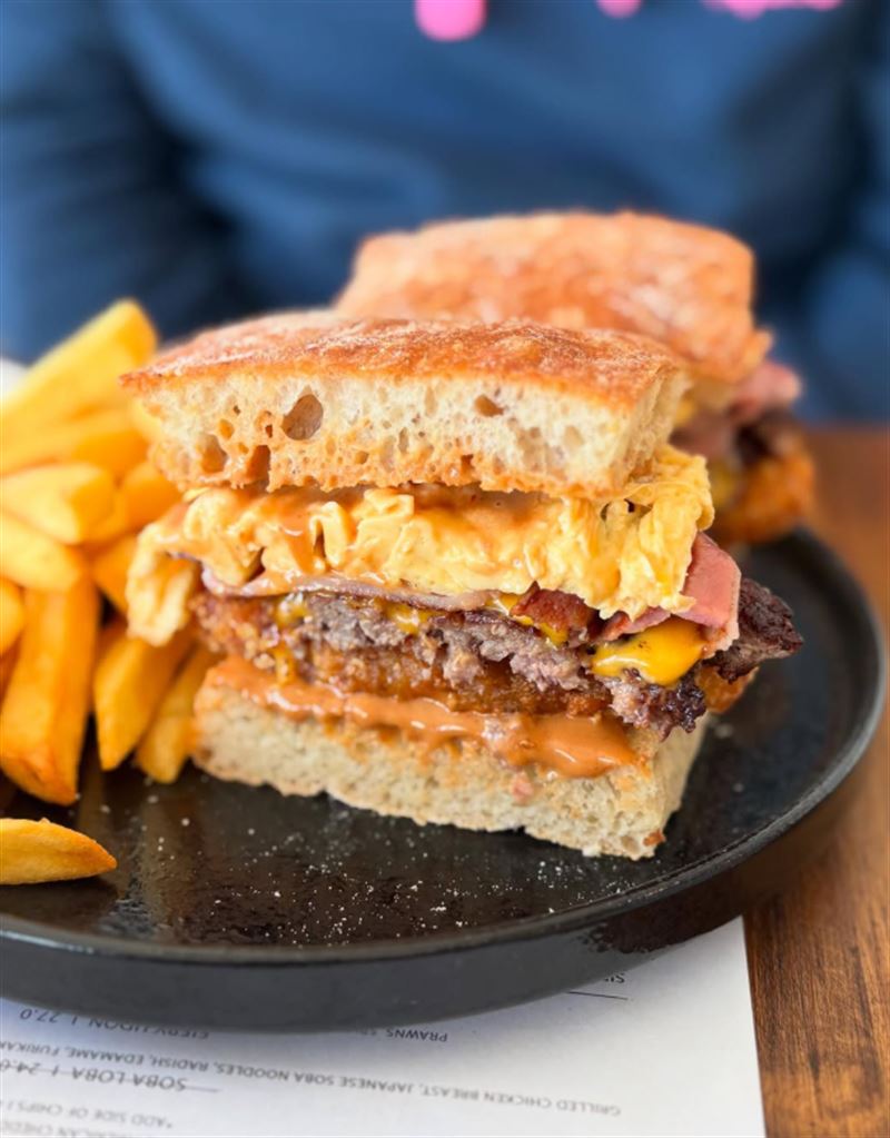 Nook’s Special: smashed patty, bacon, scrambled egg, American cheddar, hash brown, spicy mayo, focaccia and a side of chips.