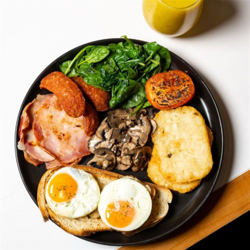 Norwood Big Breakfast featuring eggs your way with spinach, bacon, chorizo, roasted tomato, mushroom and a hash brown served on toasted sourdough or multigrain.