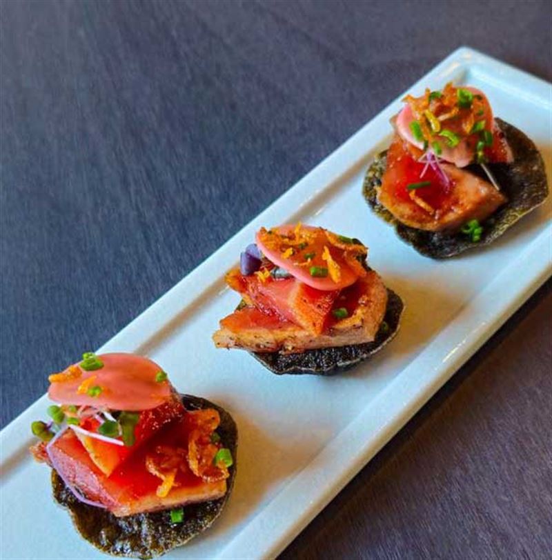 Those looking for culinary adventure seek out hidden bar NOYADE on Napier Street in Strathmore. A rustic well-worn brick entrance with a shiny nameplate announces this cool Melbourne dining destination, while indoors rocks a seductive vibe of polished wood floors, shiny black tiles, glowing Edison bulb lighting and intimate nooks for romantic rendezvous or catching up with friends over a drink. Pair a cheeky cocktail such as the Bloody Shiraz Gin Sour with Japanese tuna seaweed bites, or Wagyu steak sliders and kohlrabi salad to start; while those with heartier appetites may opt for tender grilled lamb cutlets, with mint and pea purée and sides of hand-cut chips and Cypriot halloumi bread. Finish sweetly with a divine dessert of burnt Basque cheesecake, strawberry jam sauce and berries.