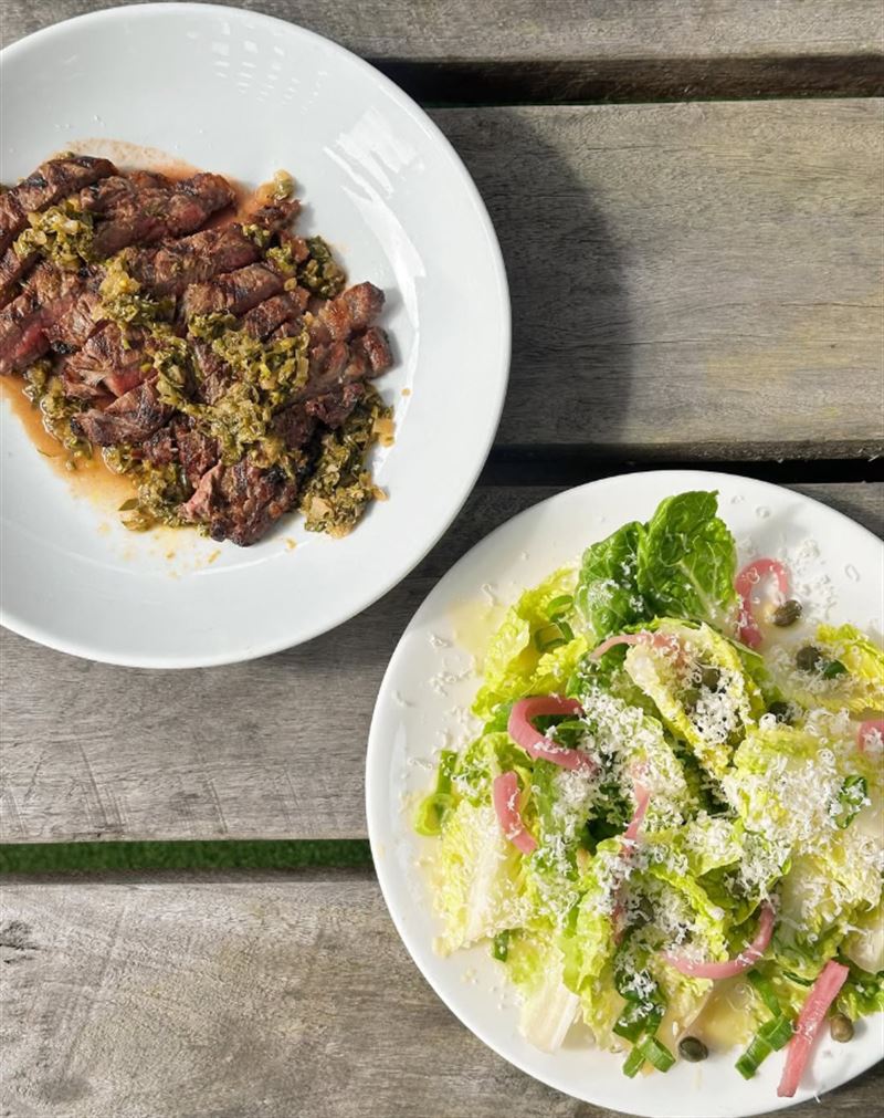 Smoked pork ribs, crispy potatoes and a gem lettuce salad on the side.