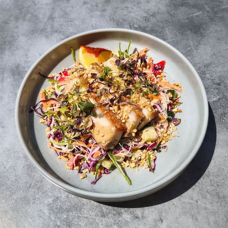 Crispy Pork Belly – served with vermicelli noodles, capsicum, carrot, pickled cucumber, snow peas, creamy mayo dressing and finished with crunchy peanuts.