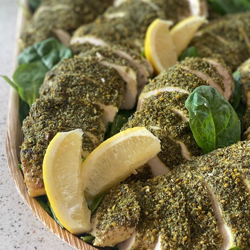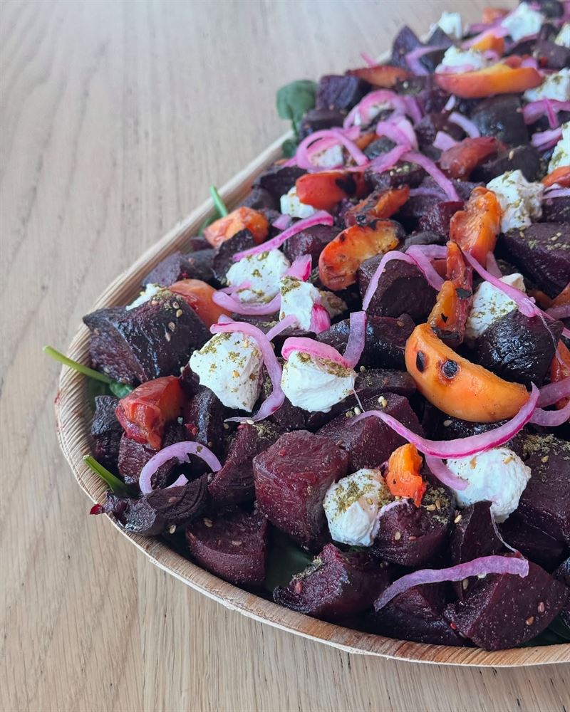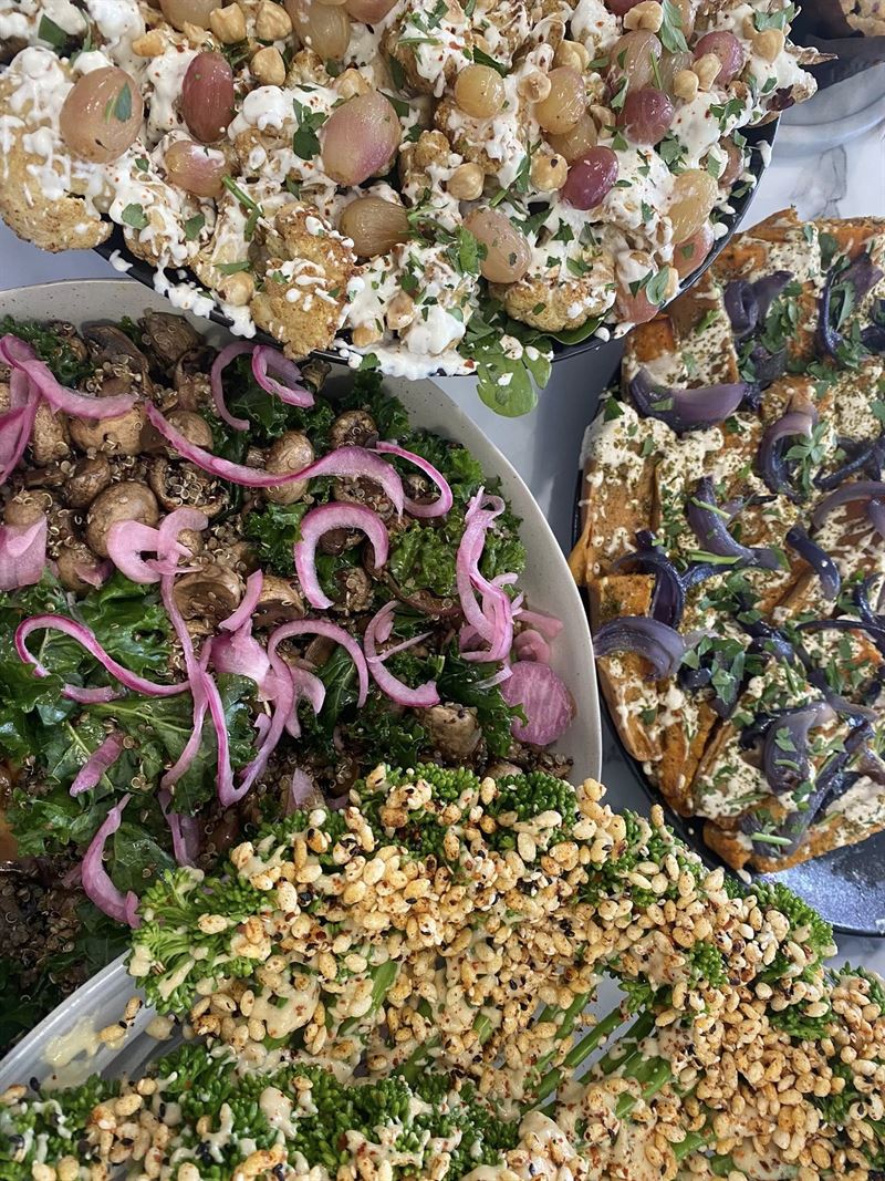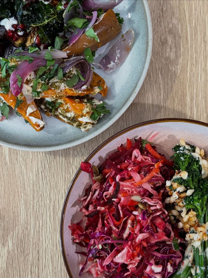 Tahini-Glazed Sweet Potato is made with Za’atar Roasted Sweet Potato, Tahini Dressing, Roasted Red Onion and Fresh Parsley.