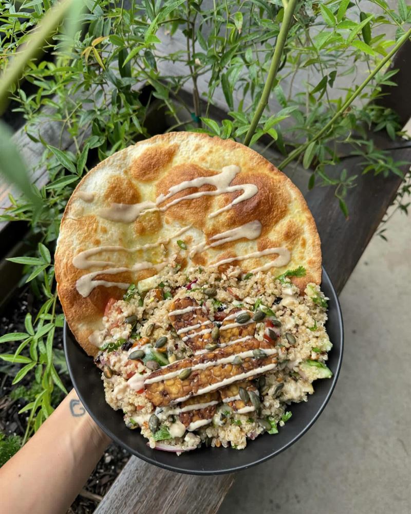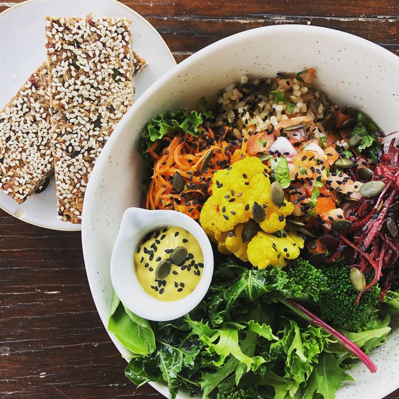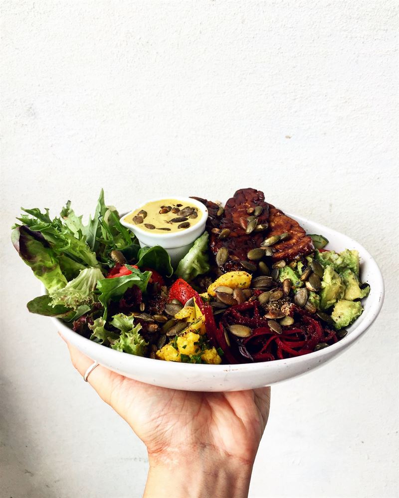 Earth Bowl, a nourishing mix of organic quinoa, mixed greens, cherry tomatoes, Italian beetroot, turmeric cauliflower, maple chickpeas and wild rice tempeh, finished with avocado, pepitas, currants and a vibrant carrot-ginger dressing.
