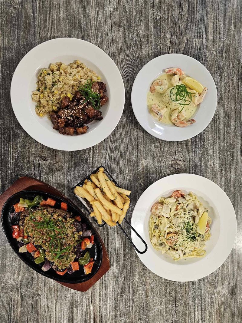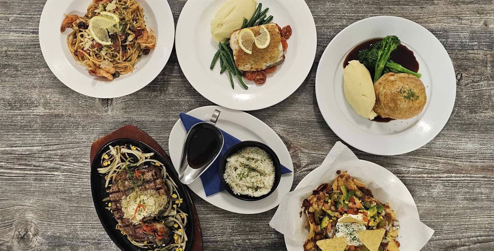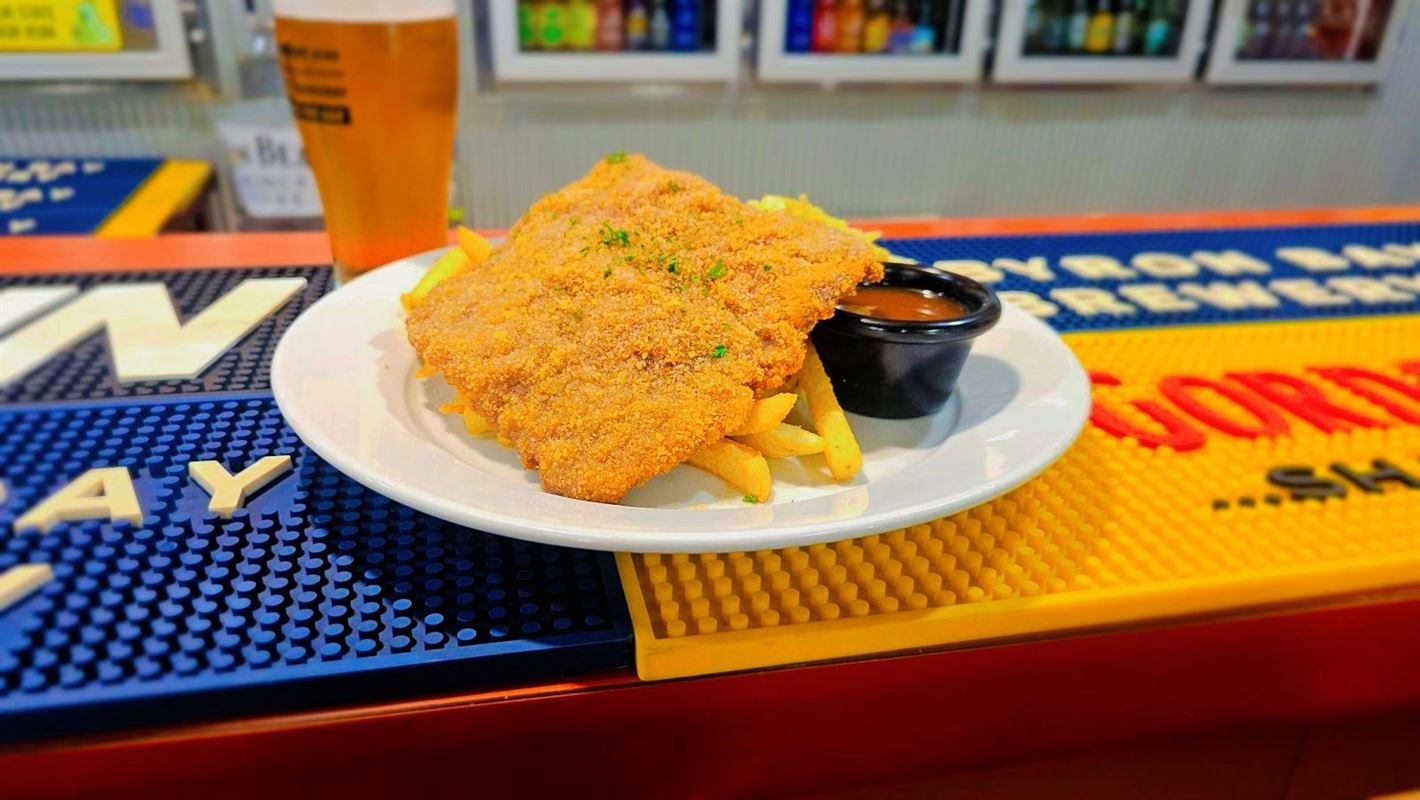 Seafood platter with beer-battered barramundi, lemon pepper calamari, creamy garlic prawns, chips, coleslaw and tartar sauce.