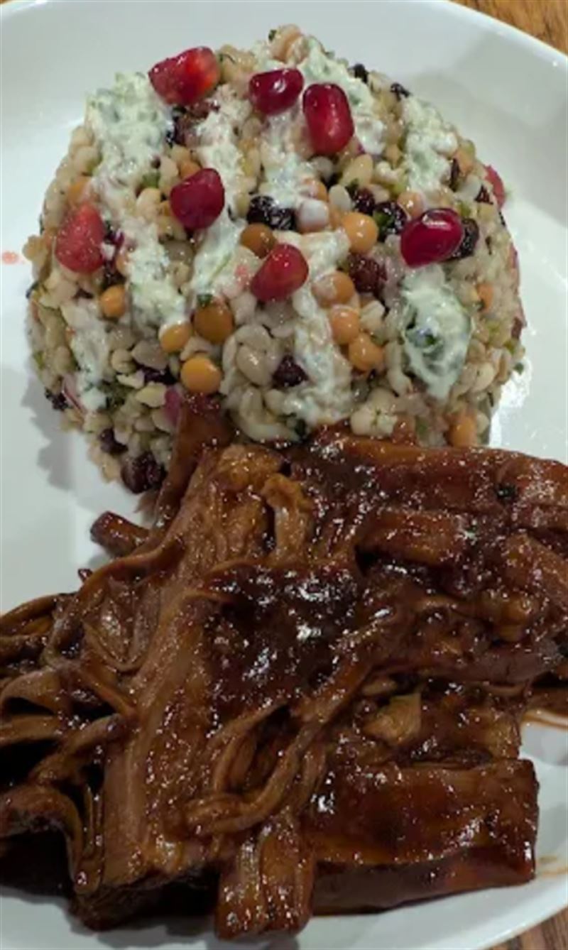 Char-grilled marinated Greek lamb with cherry tomatoes, cucumber, red onion, feta, Kalamata olives, hummus and pita bread.