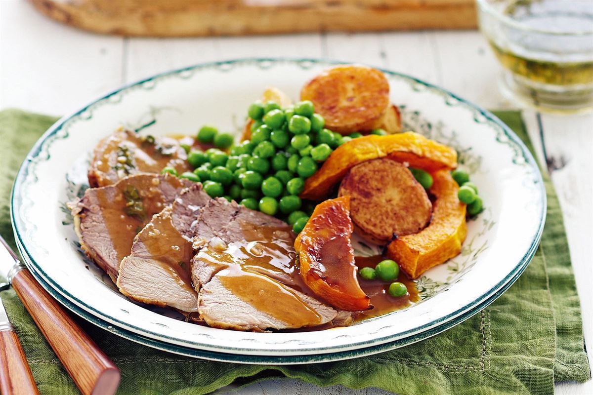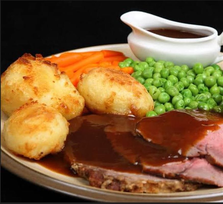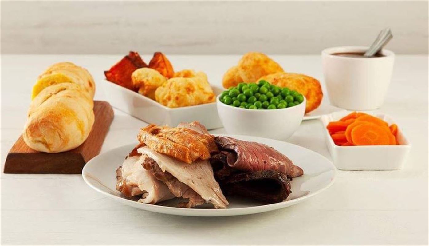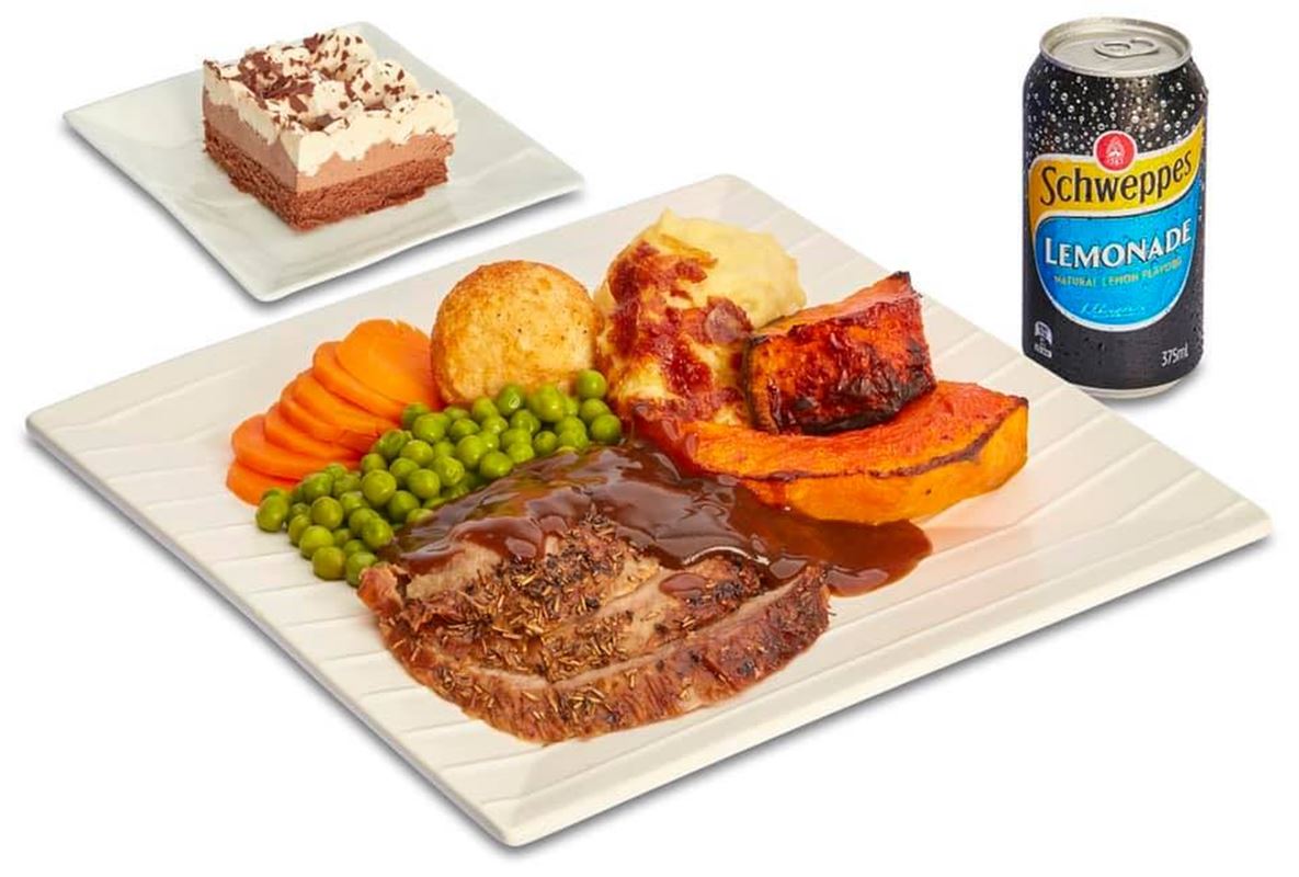 Family Combo: sliced roast meat, roast potatoes, pumpkin, cauliflower, peas, carrots, gravy, garlic bread and a bottle of soft drink.