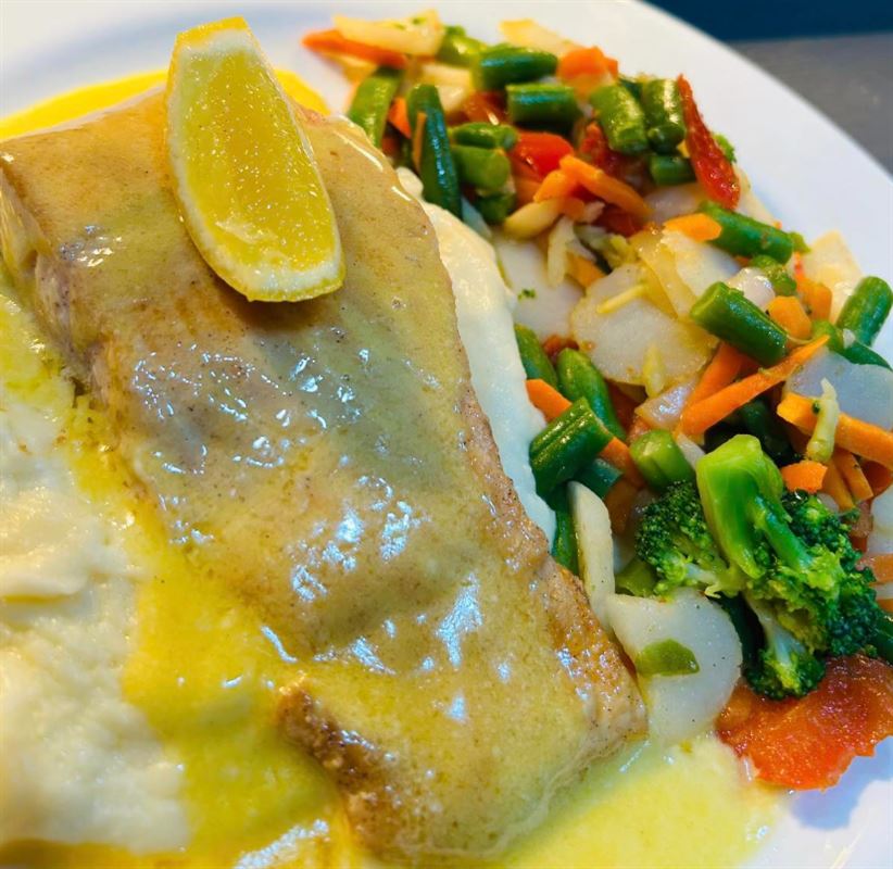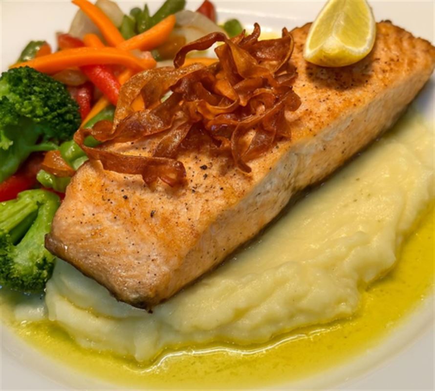 Slow cooked lamb shank, served with sauteed vegetables and mashed potato.