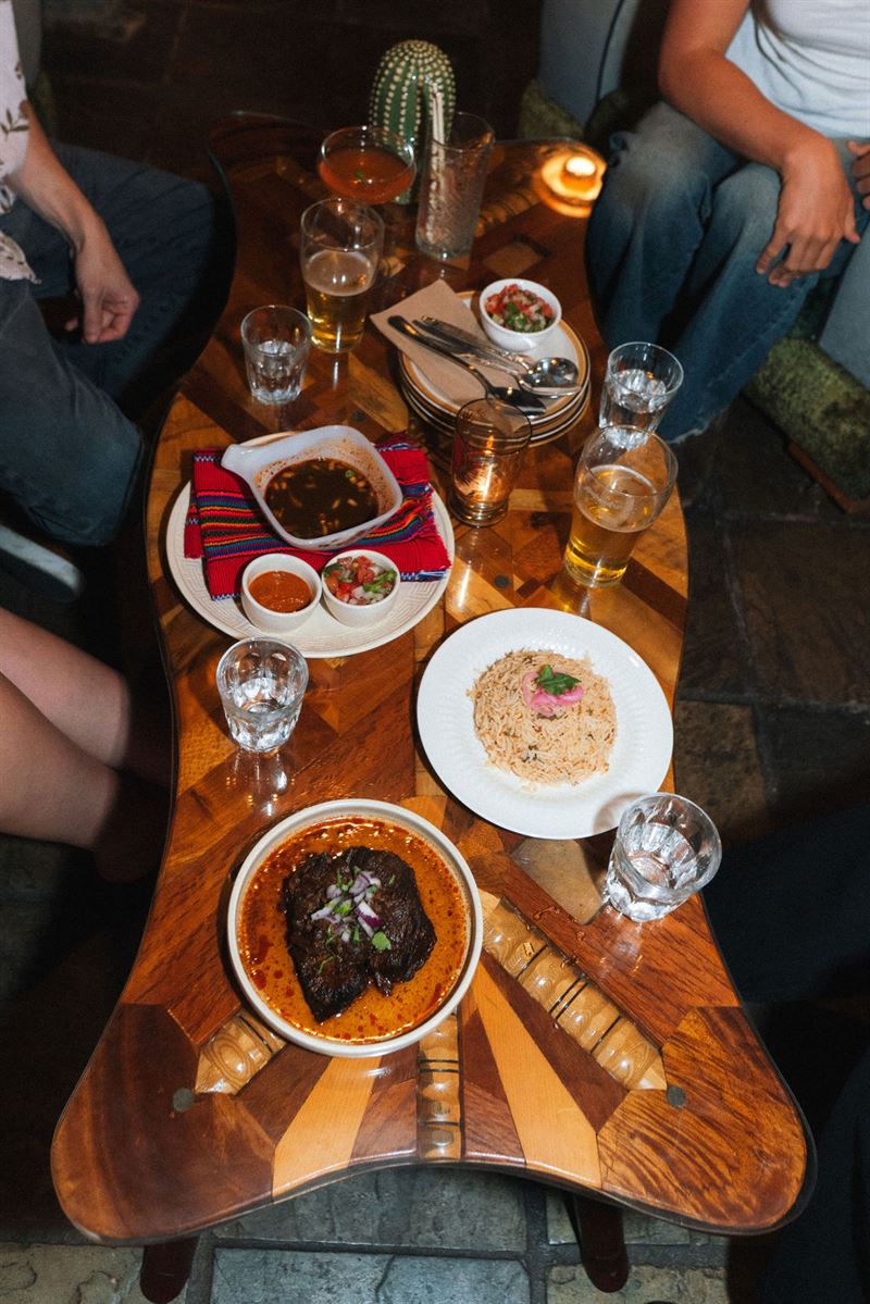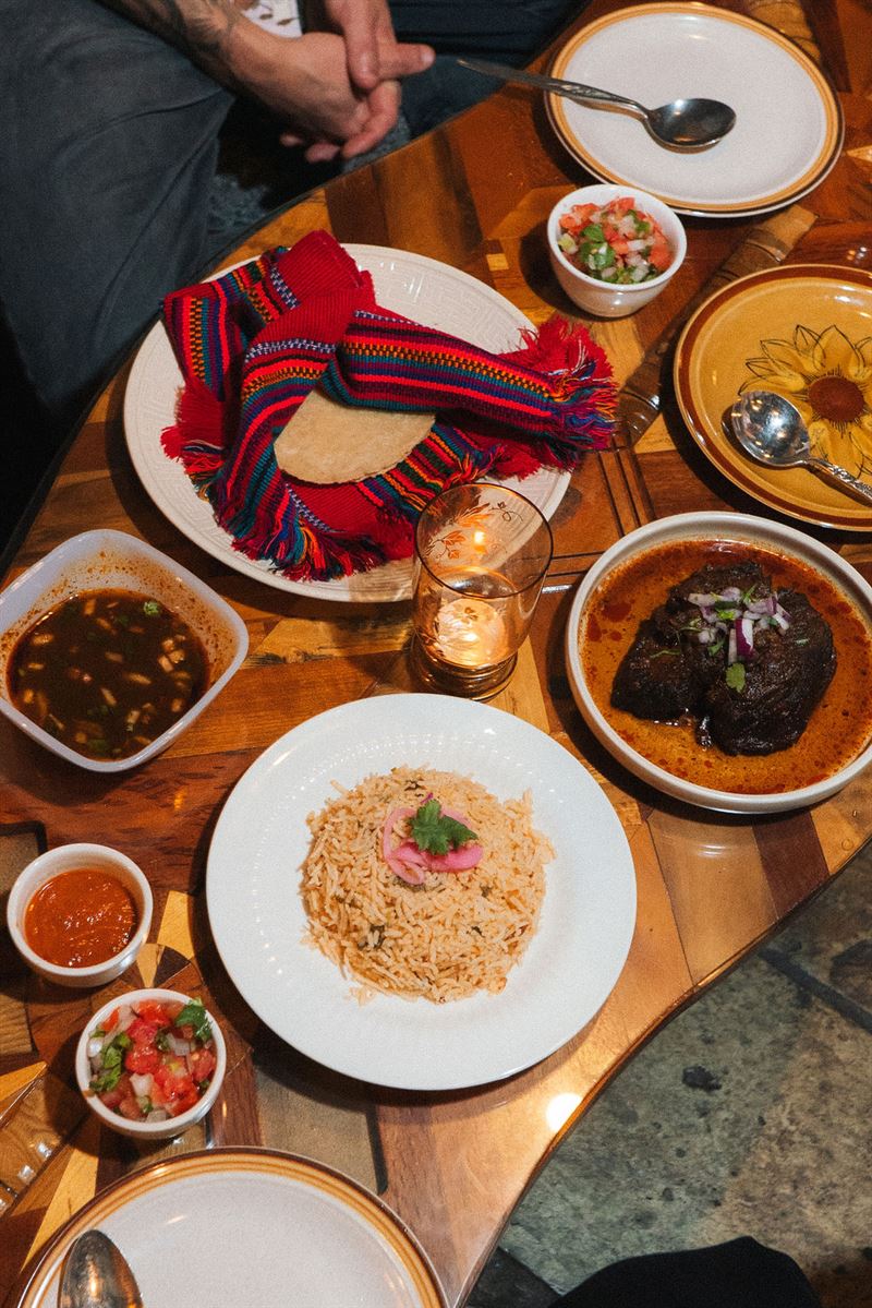 Pollo con Mole: chicken Maryland in rich, traditional mole sauce with chillies, spices, nuts, seeds and chocolate, served with Mexican rice, onion, lime, pico de gallo and corn tortillas.