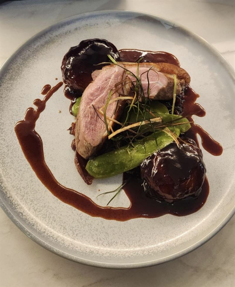 Seared duck breast with pickled red cabbage and red wine jus.